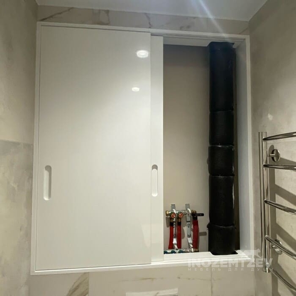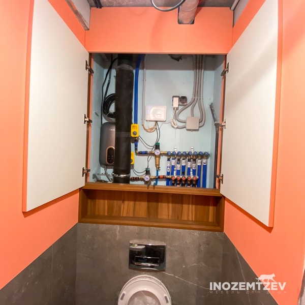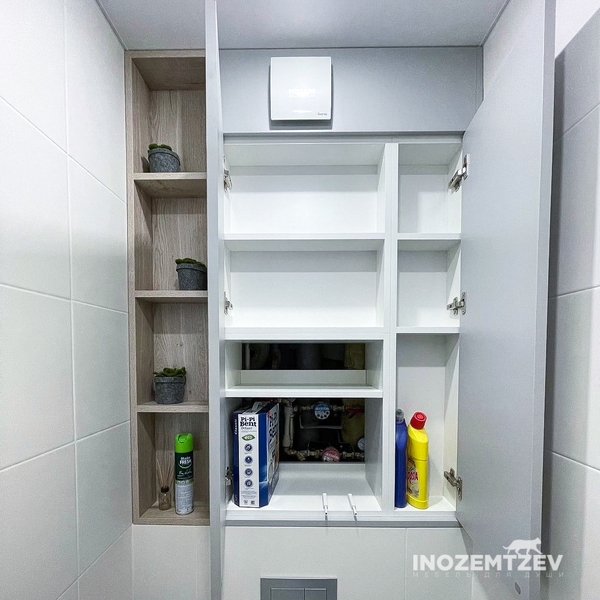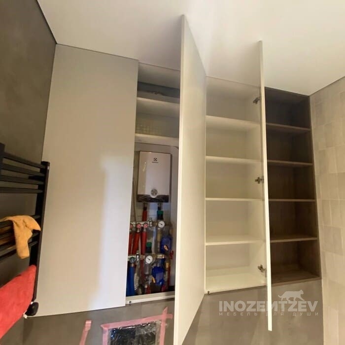 Функционал шкафа представляет из себя нишу для скрытия коммуникация и полочки для хозяйственных нужд