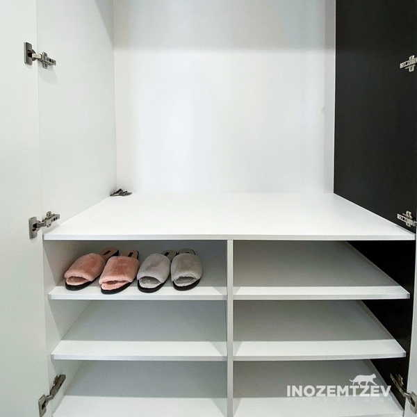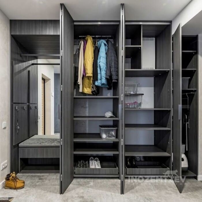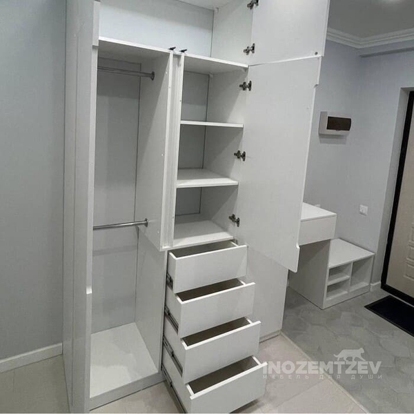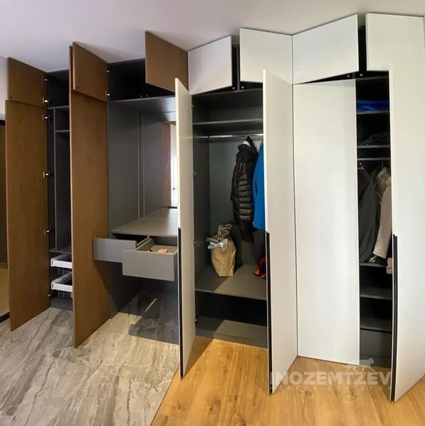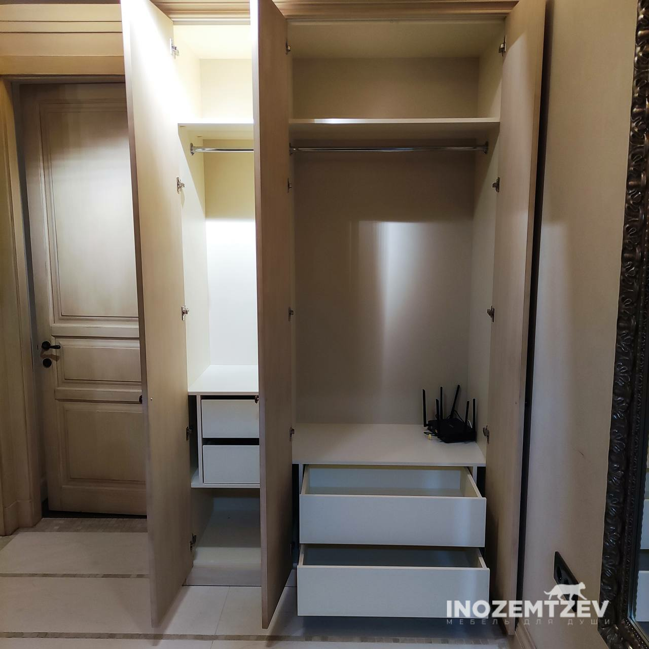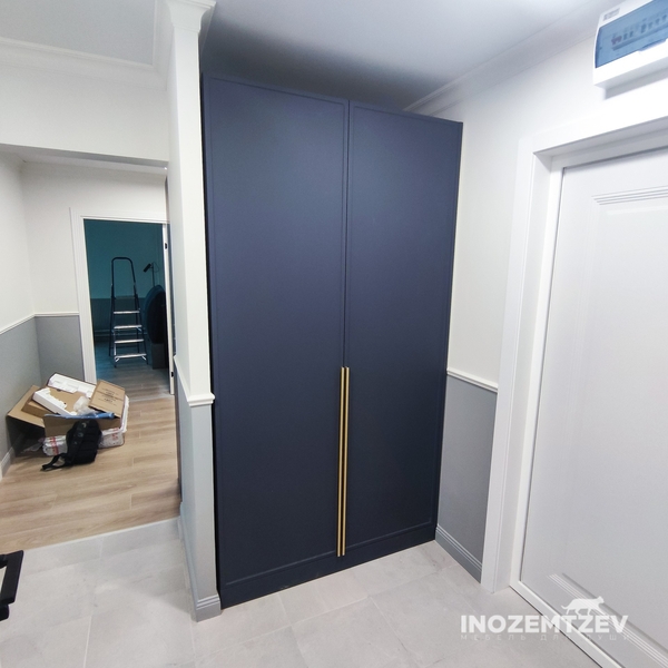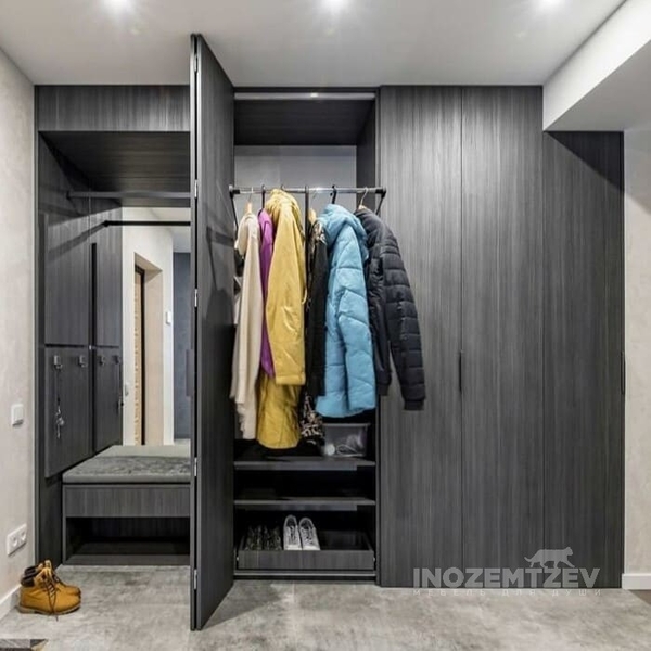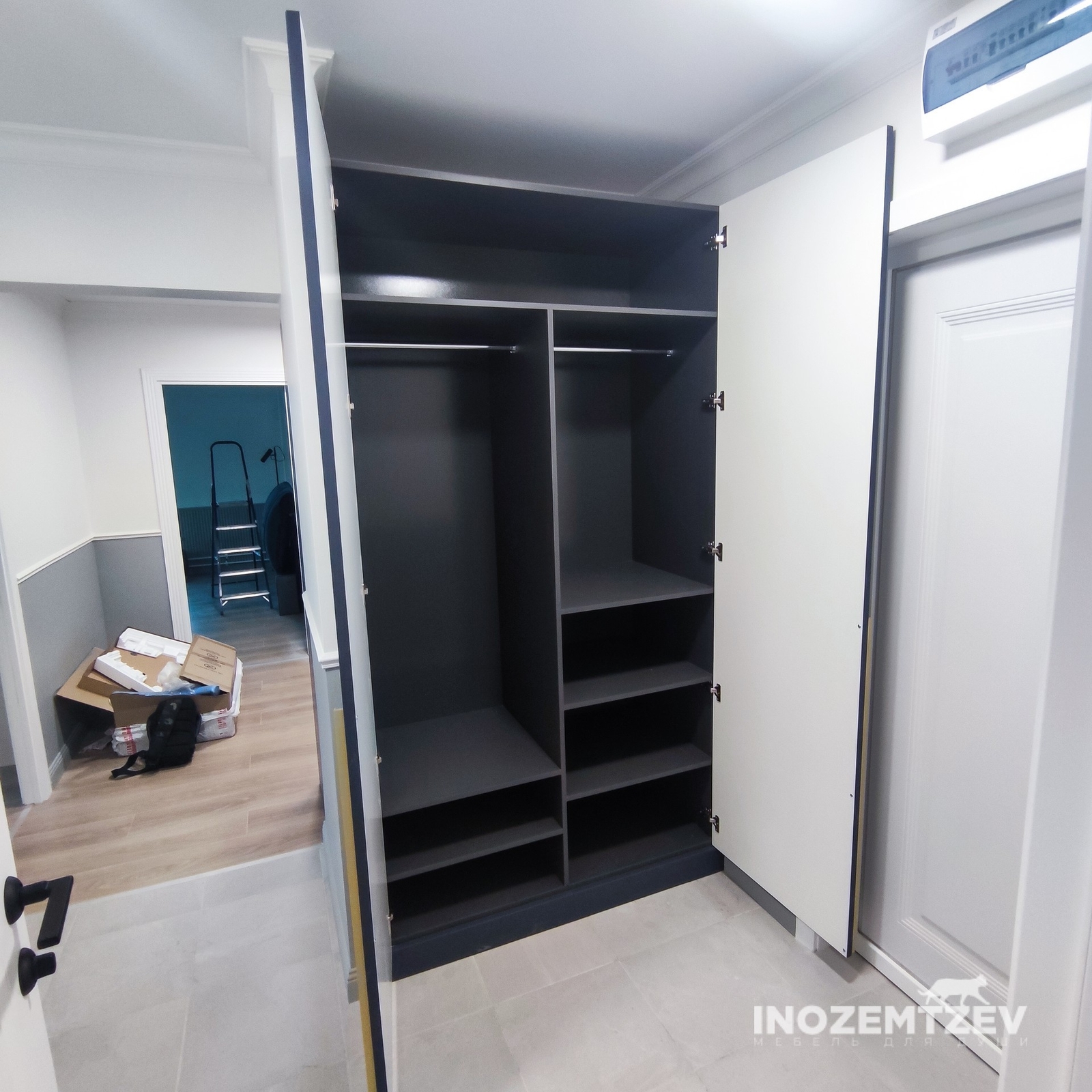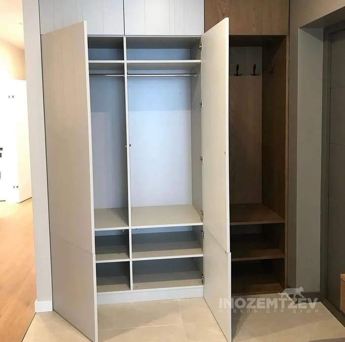 Стильный шкаф в прихожую с распашными дверями с отдельными зонами хранения, материал: МДФ крашенный с фрезеровкой