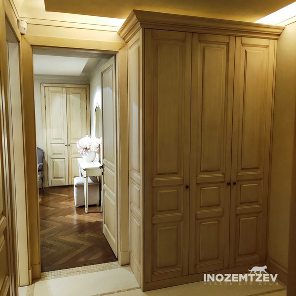Шикарный шкаф в прихожую зону из МДФ эмали с фрезеровкой и патиной. .Корпус и внутреннее наполнение - ЛДСП Egger Ванильный желтый. Фурнитура Blum. Размеры: 2300х1390 мм