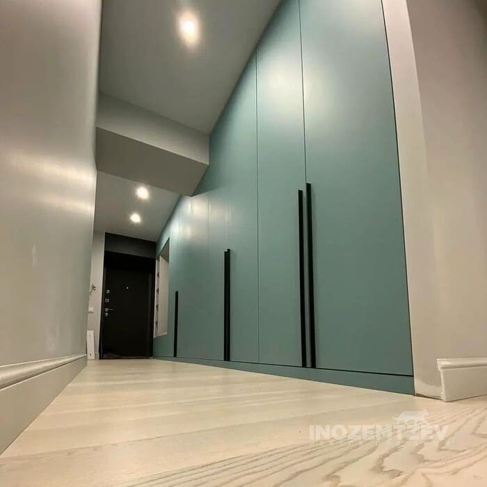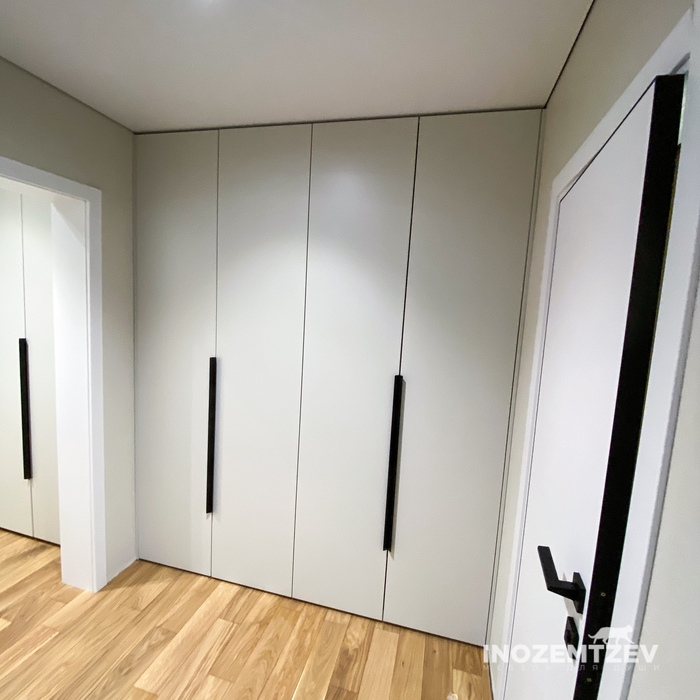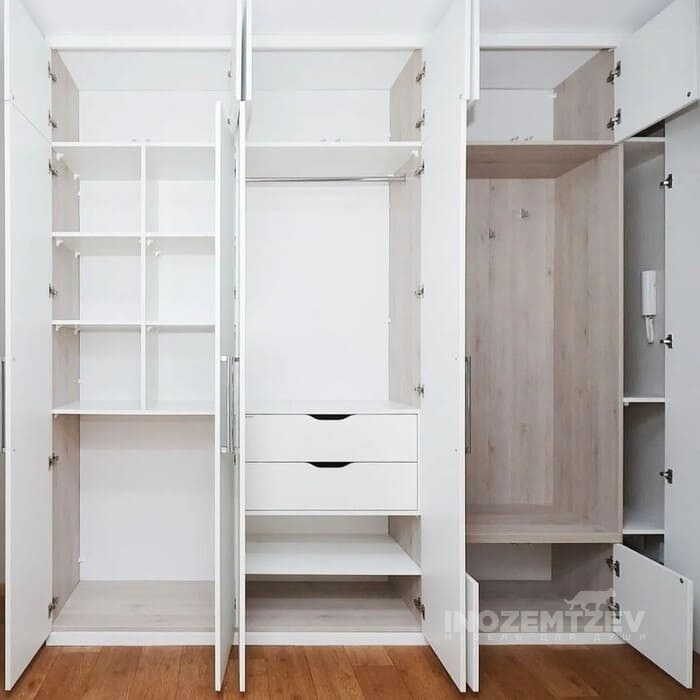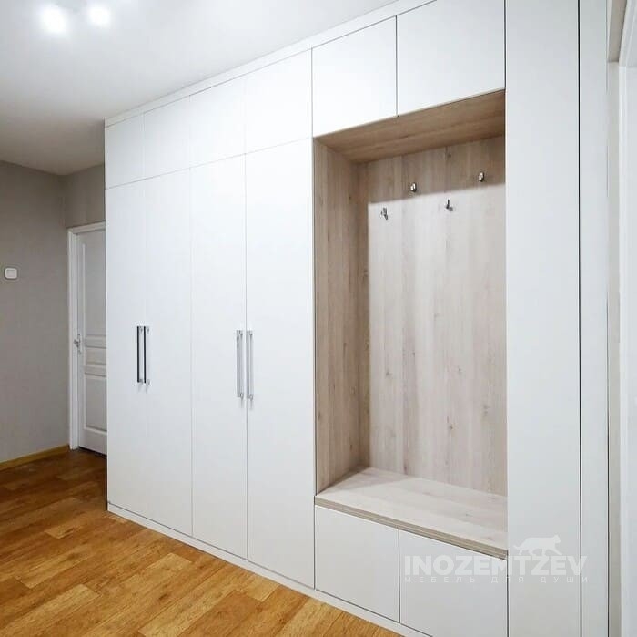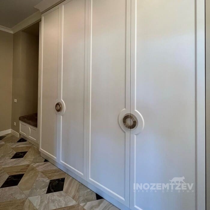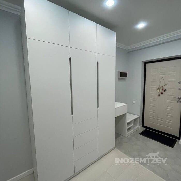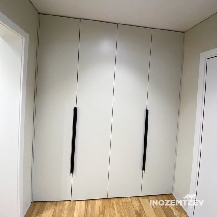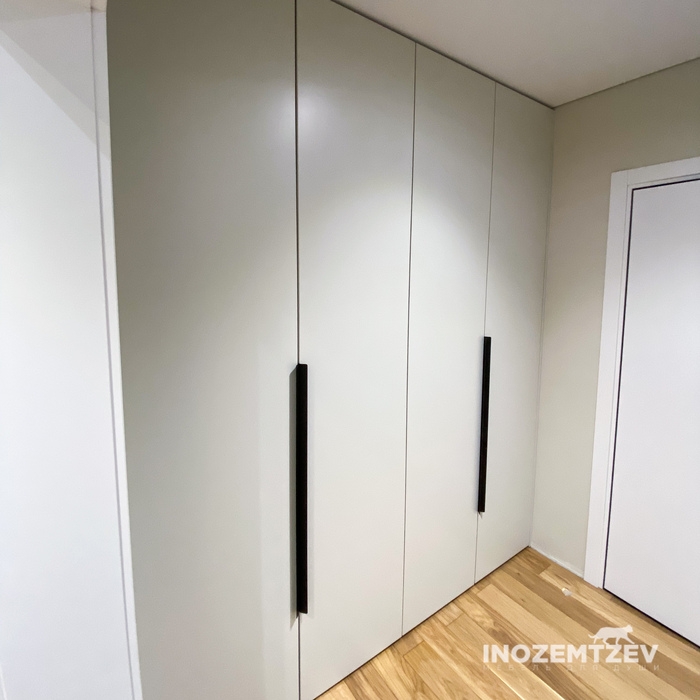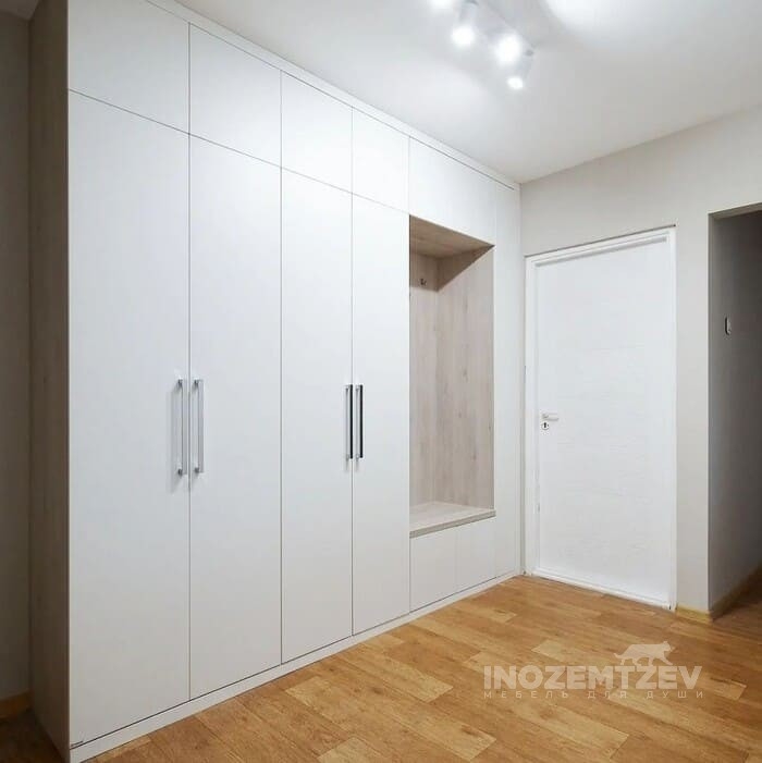 Встроенный распашной шкаф в прихожую из экологичного, долговечного и устойчивого к царапинам МДФ эмали, надежная фурнитура Blum