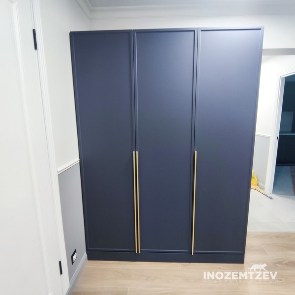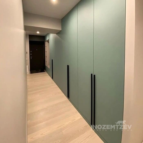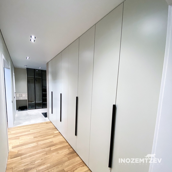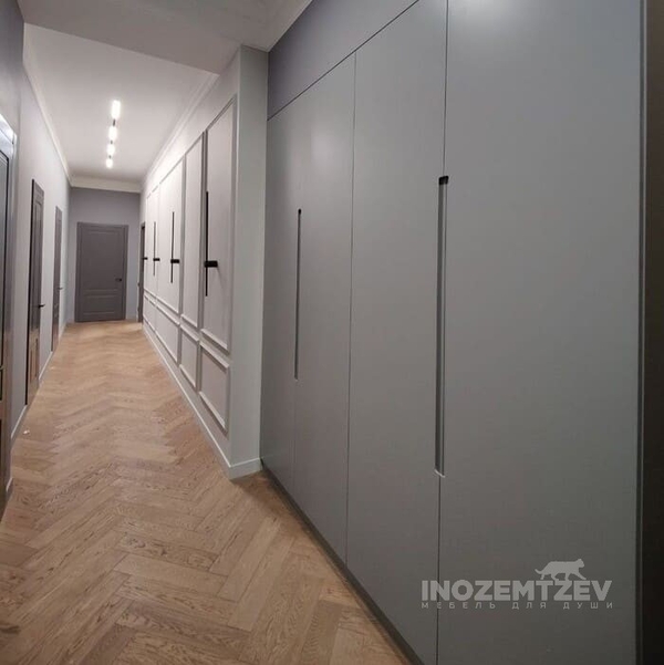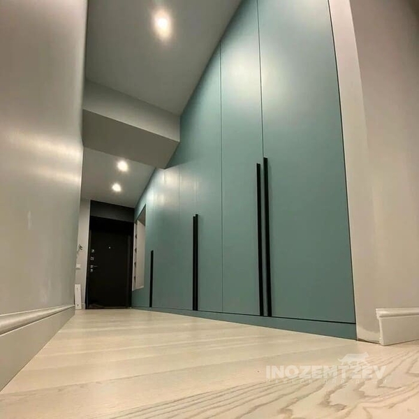 Длинный распашной шкаф для одежды в прихожую с антресолью, фасады выполнены из МДФ в пленке ПВХ, корпус - ЛДСП Egger, профиль-ручки