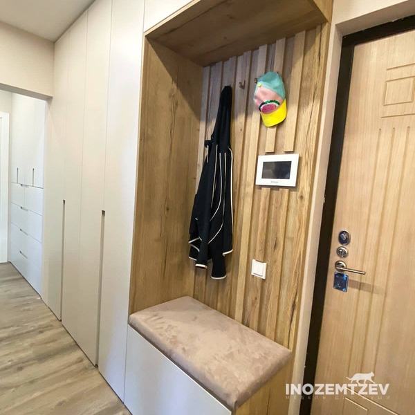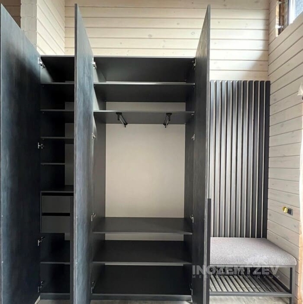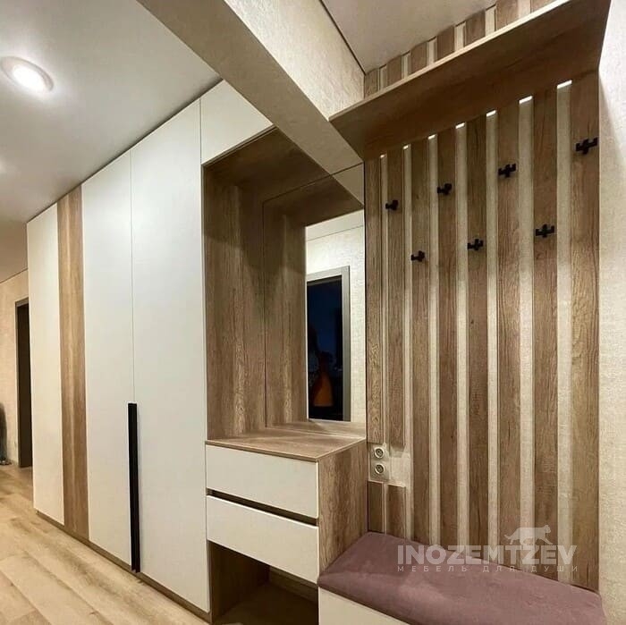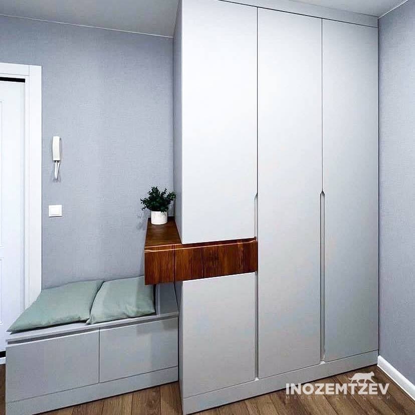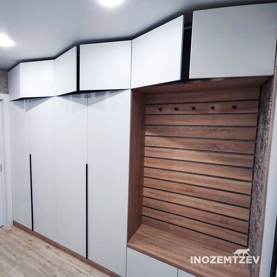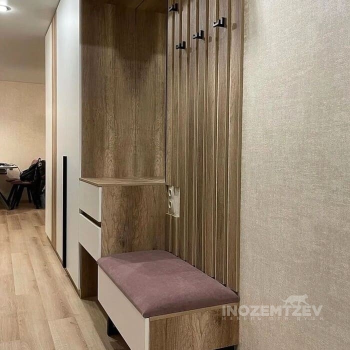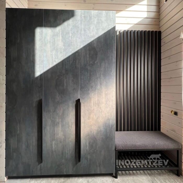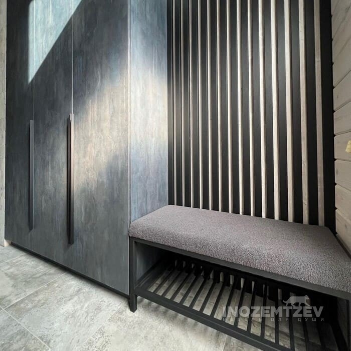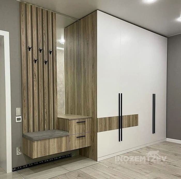 Современный распашной шкаф в прихожую с мягкой сидушкой и реечной стеновой панельюВс