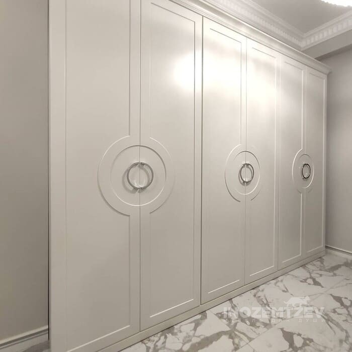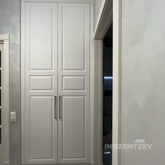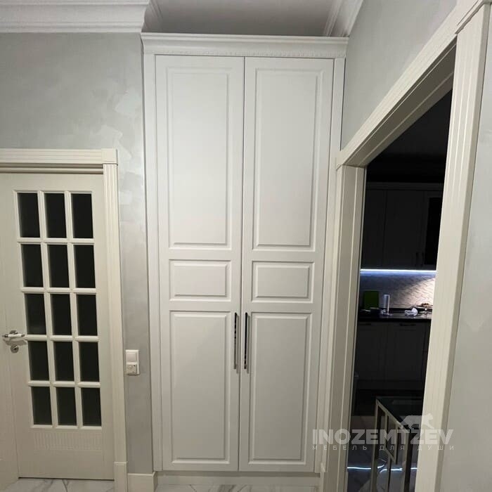 Встроенный глубокий шкаф в прихожую в классическом стиле из МДФ в пленке ПВХ с хромированными ручками