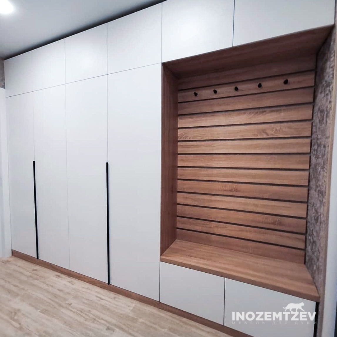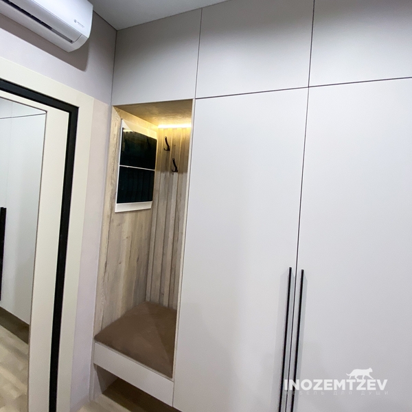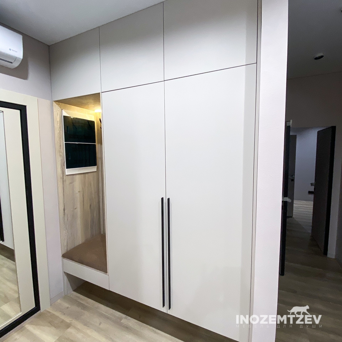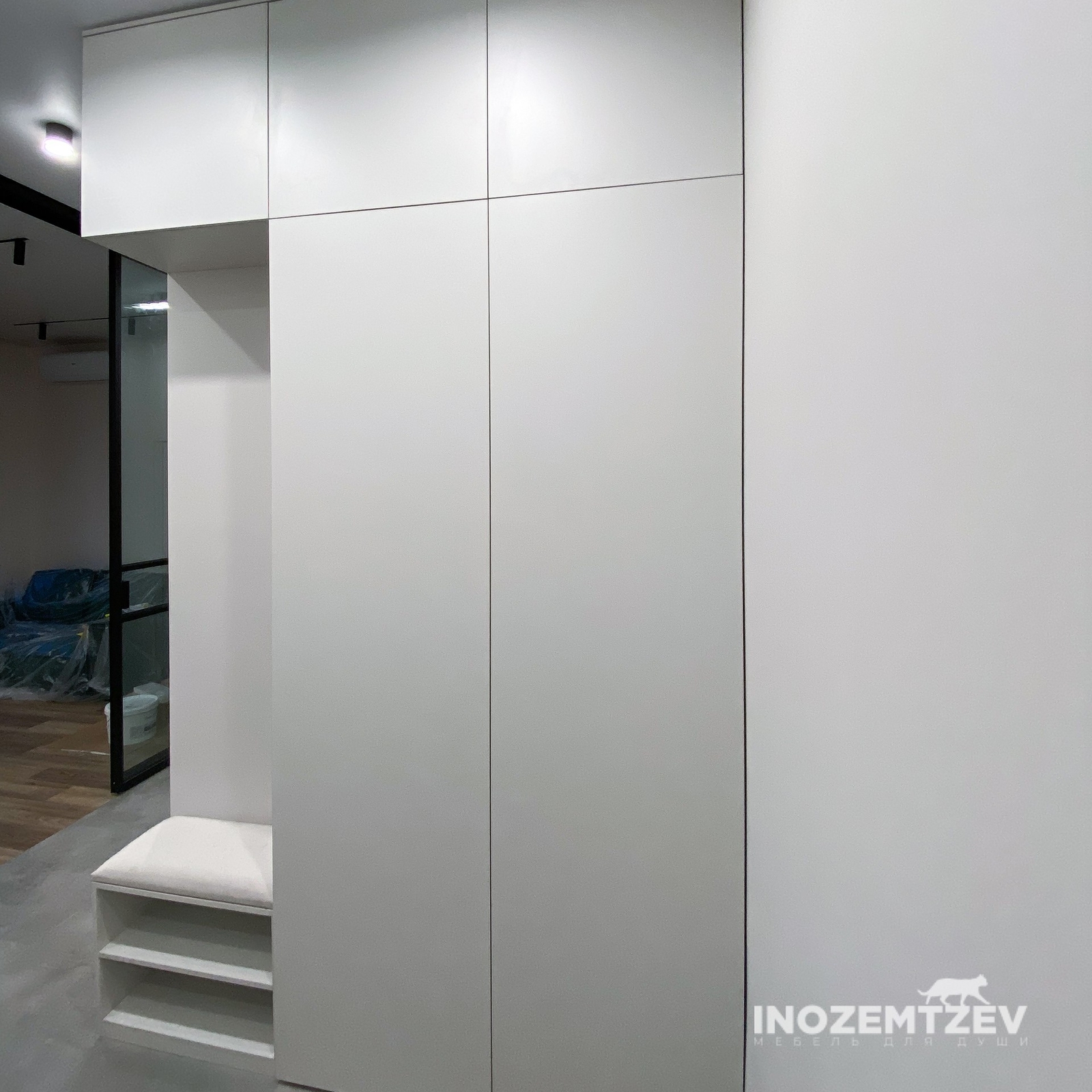 Высокий шкаф в прихожую с фрезеровкой и подсветкой. Фасадная часть: МДФ эмаль гладкий и с фрезеровкой. Корпус и наполнение: ЛДСП Egger Орех Линкольн H1714. Пуфик с мягкой сидушкой