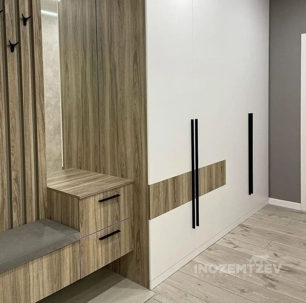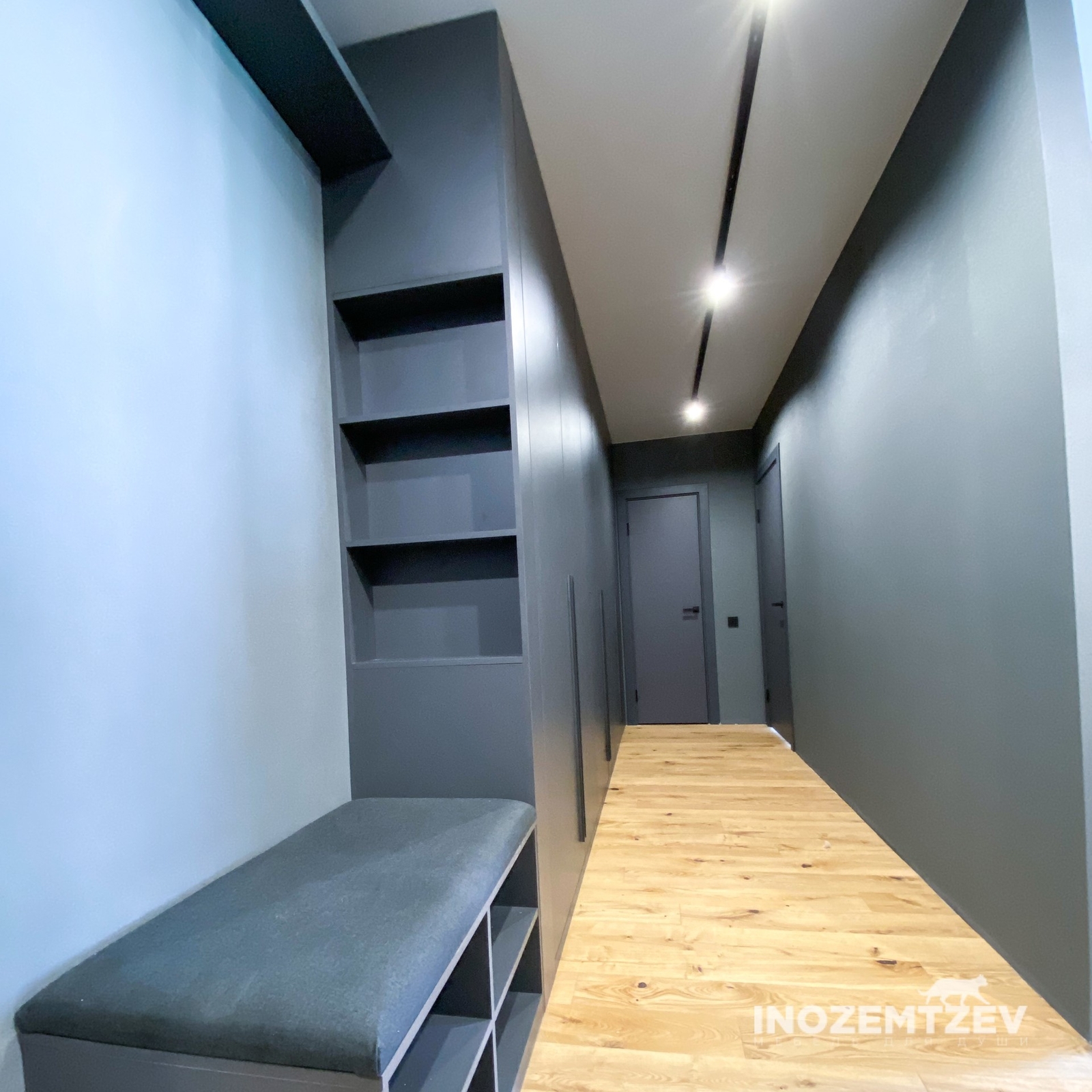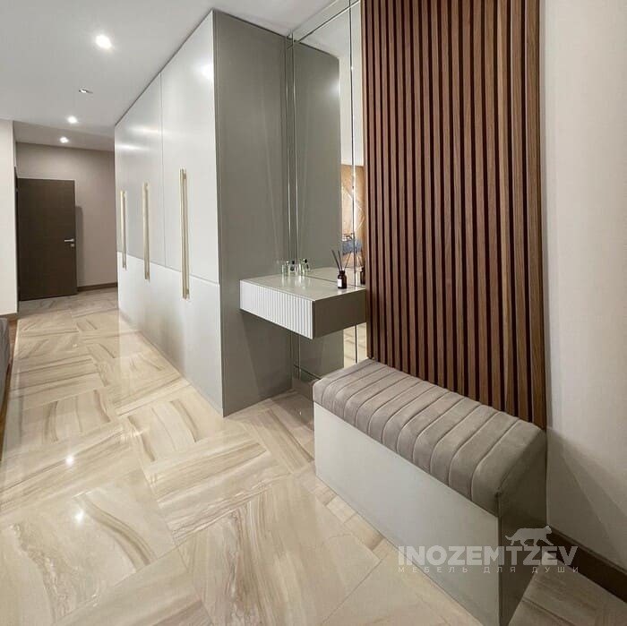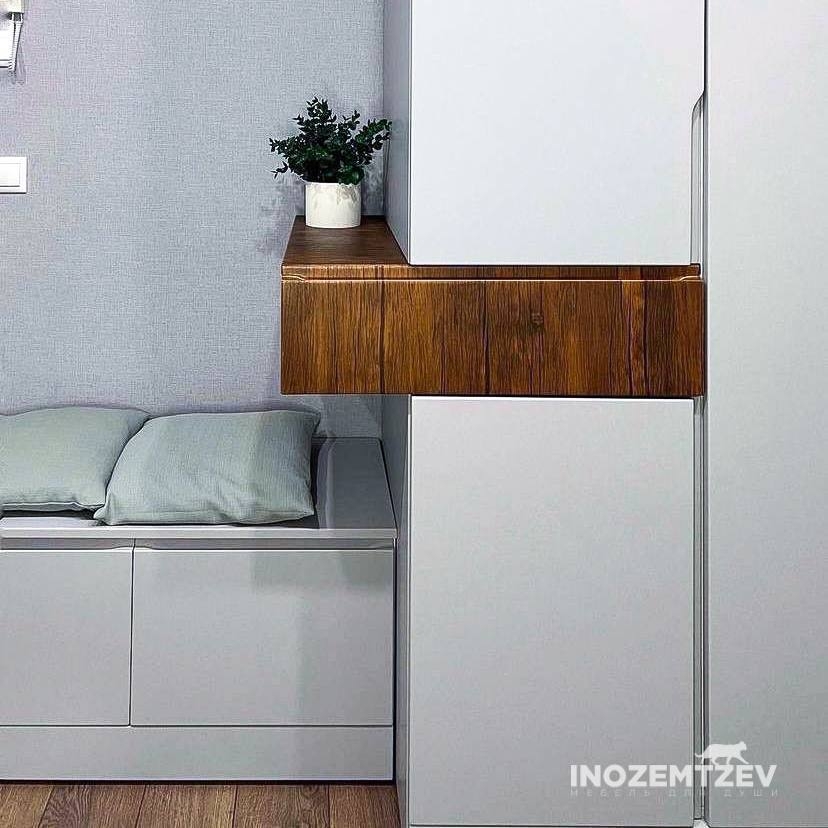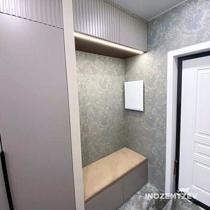 Высокий шкаф в прихожую с фрезеровкой и подсветкой. Фасадная часть: МДФ эмаль гладкий и с фрезеровкой. Корпус и наполнение: ЛДСП Egger Орех Линкольн H1714. Пуфик с мягкой сидушкой