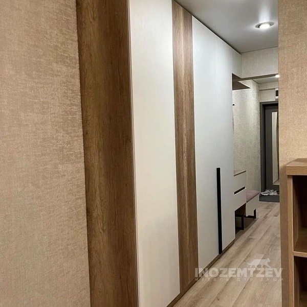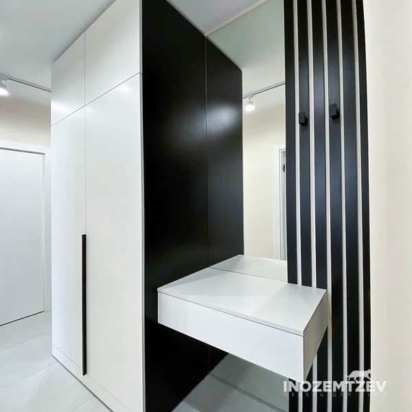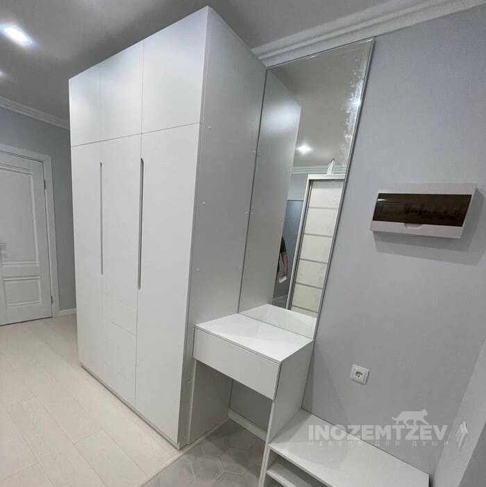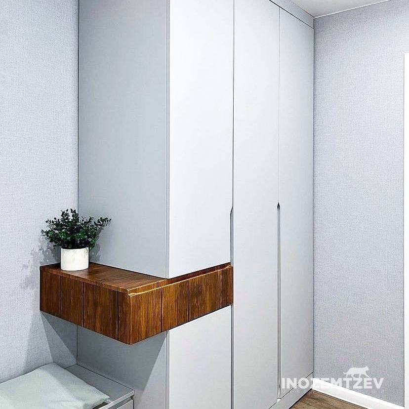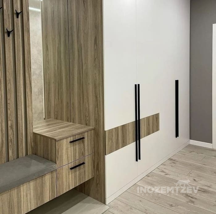 Cовременный шкаф для одежды в прихожую, выполненный в сочетании трех цветов, комбинация материалов МДФ и ЛДСП, подвесная тумбочка и зеркало посередине для максимального удобства