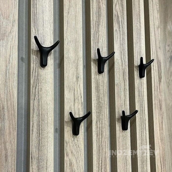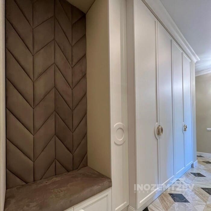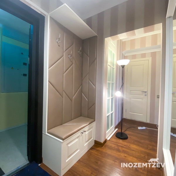 Напольная тумба с мягкой стеновой панелью, пуфом из экокожи и крючками для одежды