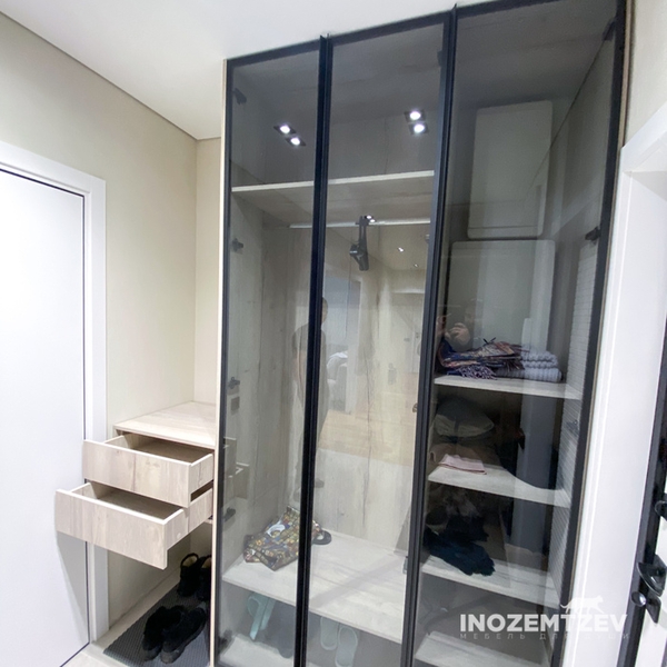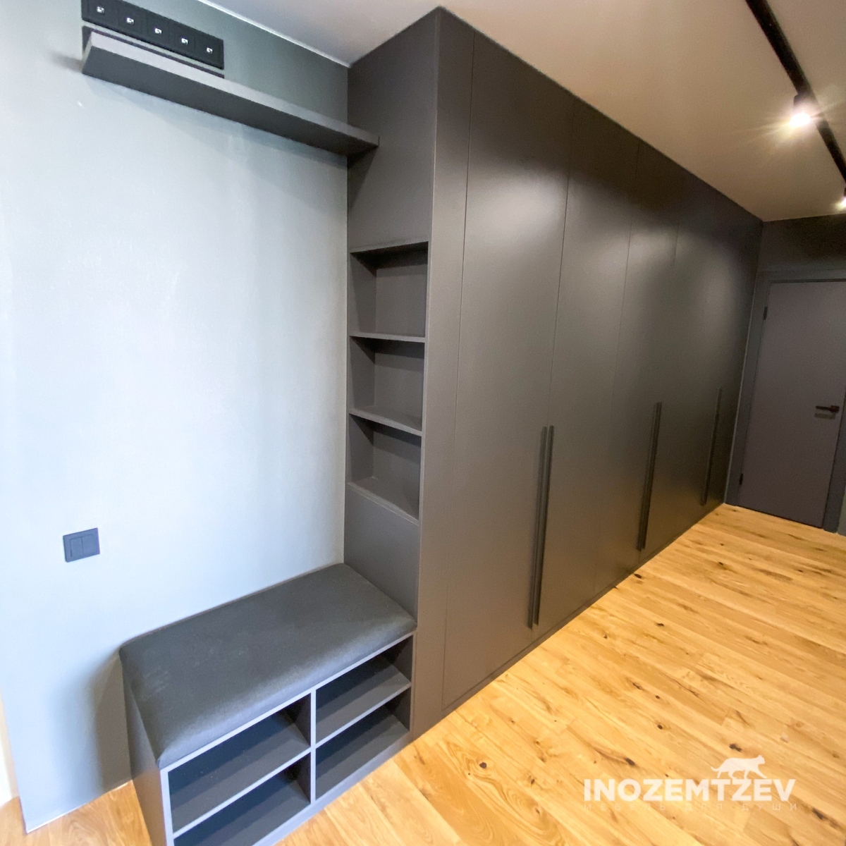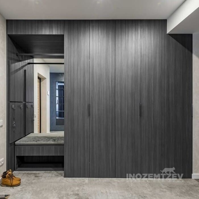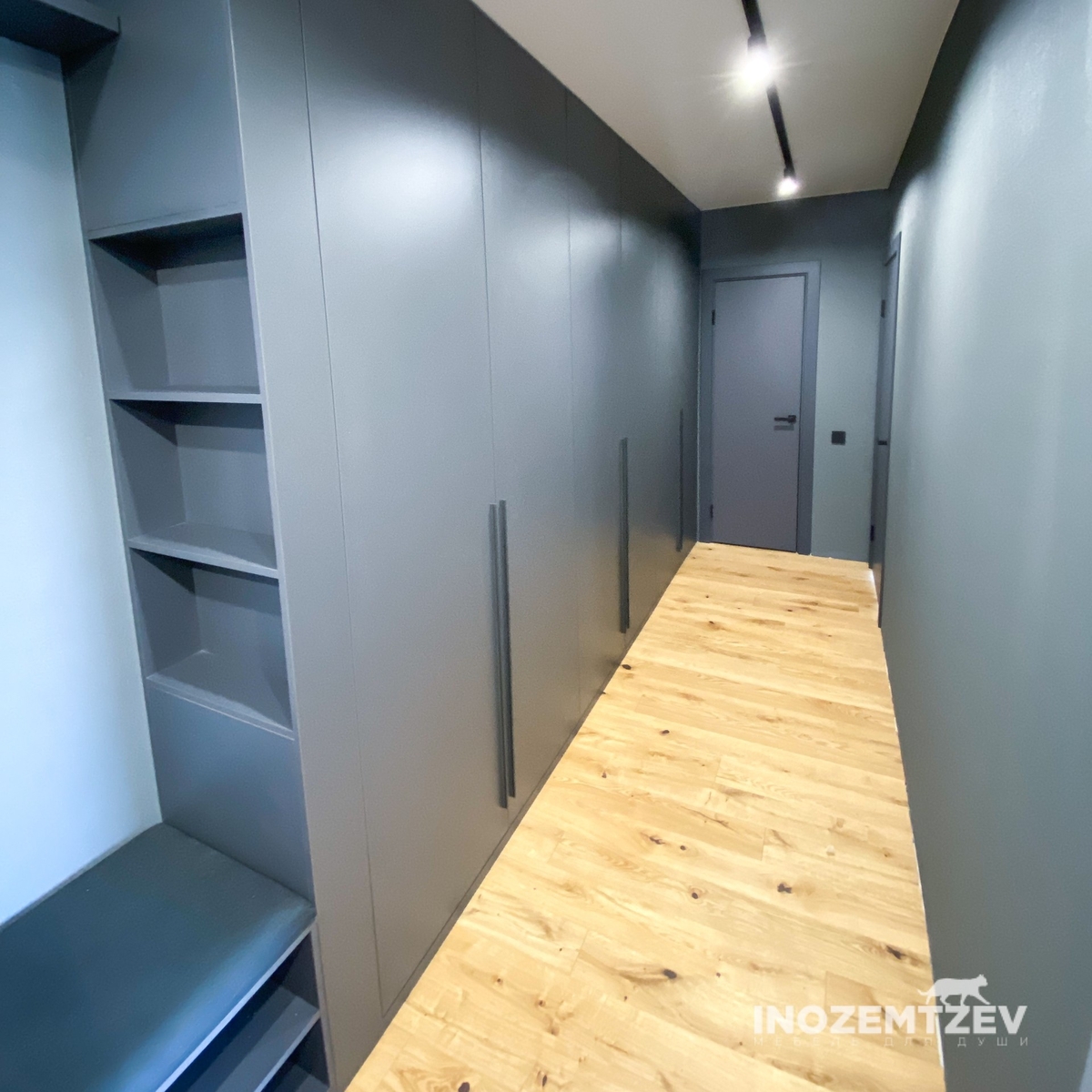 Стильный шкаф в прихожую. Материал корпуса - ЛДСП Egger Диамант серый. Фурнитура Blum