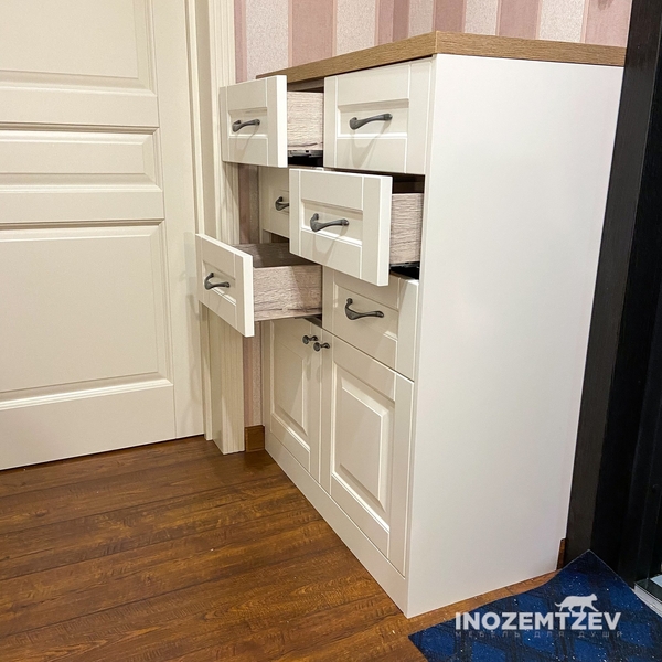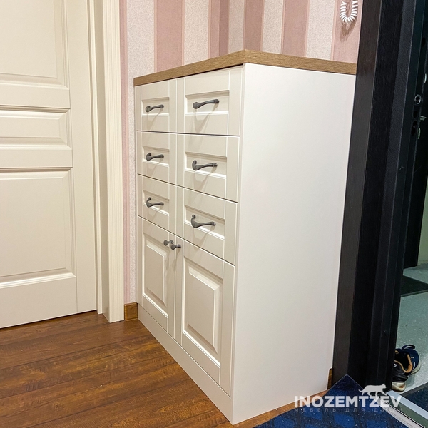 Комод в прихожую, внутренняя часть и столешница – ЛДСП Egger Дуб Галифакс белый, фасадная часть – МДФ эмаль с фрезеровкой, фурнитура Blum