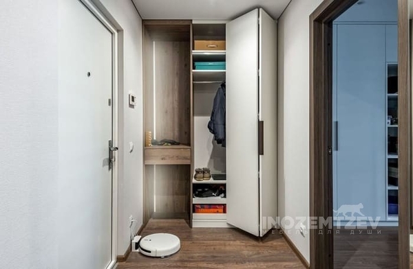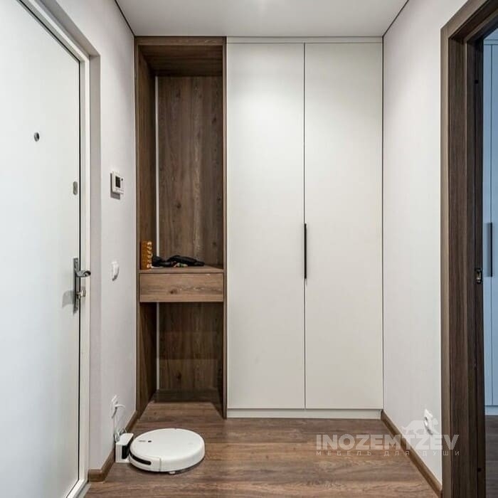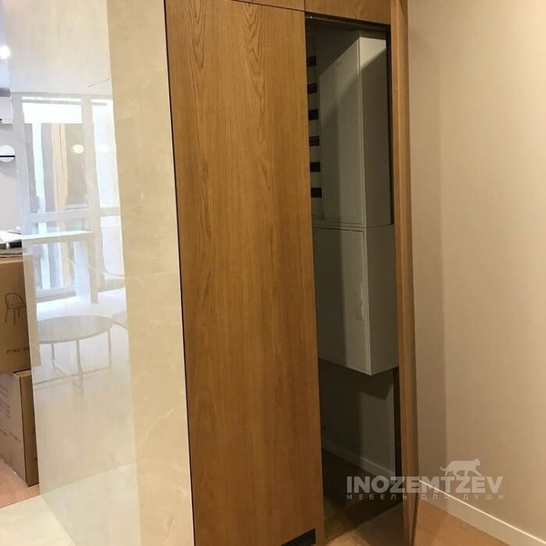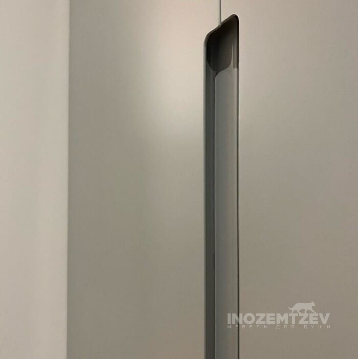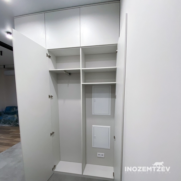 Шкаф в прихожую для одежды с отделением под пылесос, гладильную доску, при открытии двери автоматически загорается свет. Материал: МДФ эмаль с интегрированной ручкой, корпус - ЛДСП