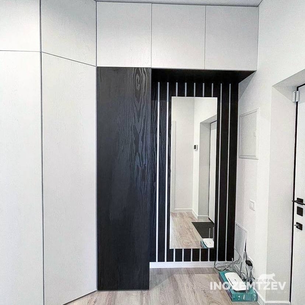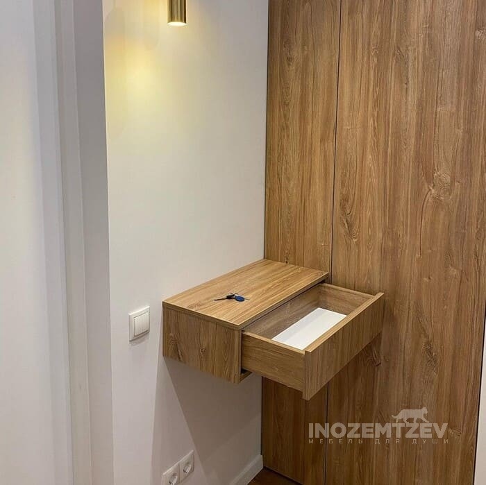 Закрытый шкаф в прихожую с комбинированными распашными фасадами из ЛДСП Egger и подвесная ключница с выдвижным ящиком