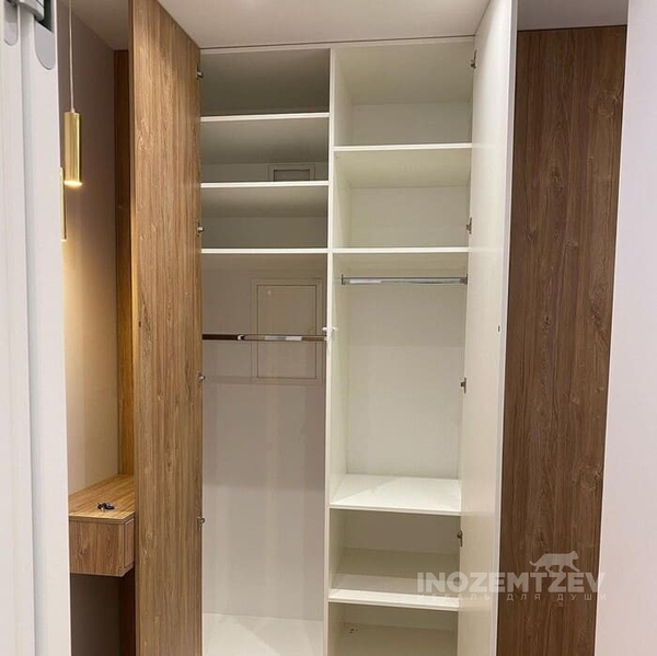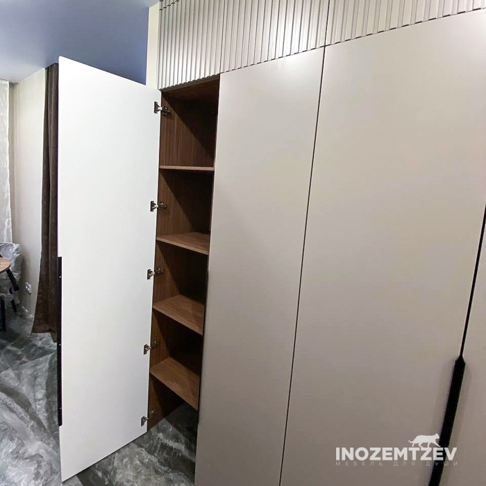 Белый шкаф в прихожую с текстурными боковыми фасадами и открытой нишей для одежды из ЛДСП Egger, антресоли выполнены ссистемой открывания push-to-open.