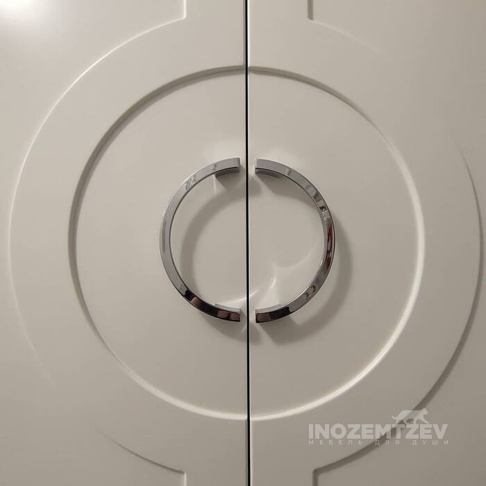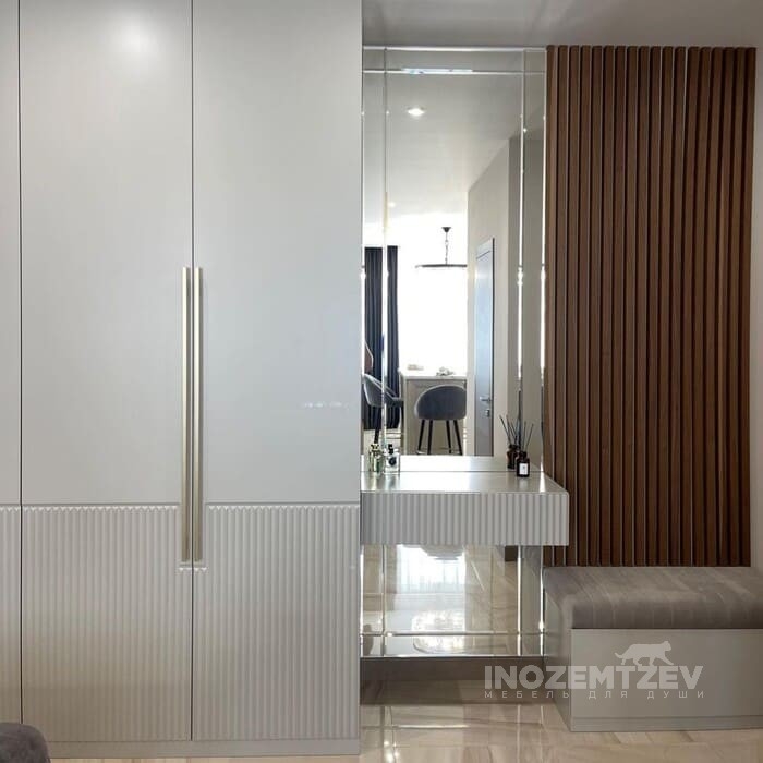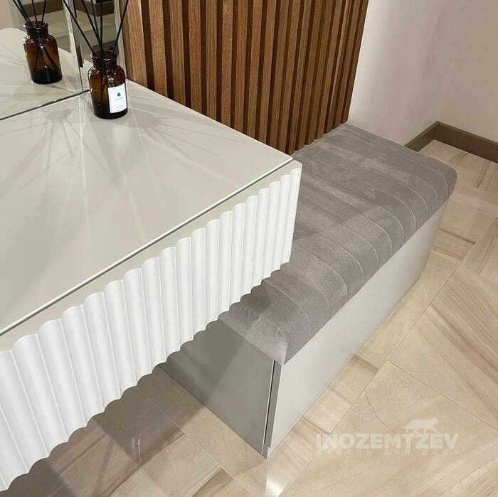 Распашной шкаф с 3Д фасадами из МДФ эмали с навесным выдвижным ящиком для мелочей, мягким пуфиком и реечной панелью