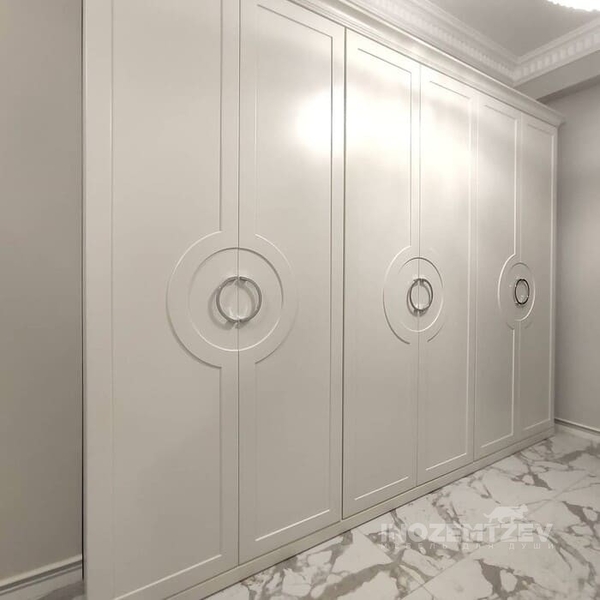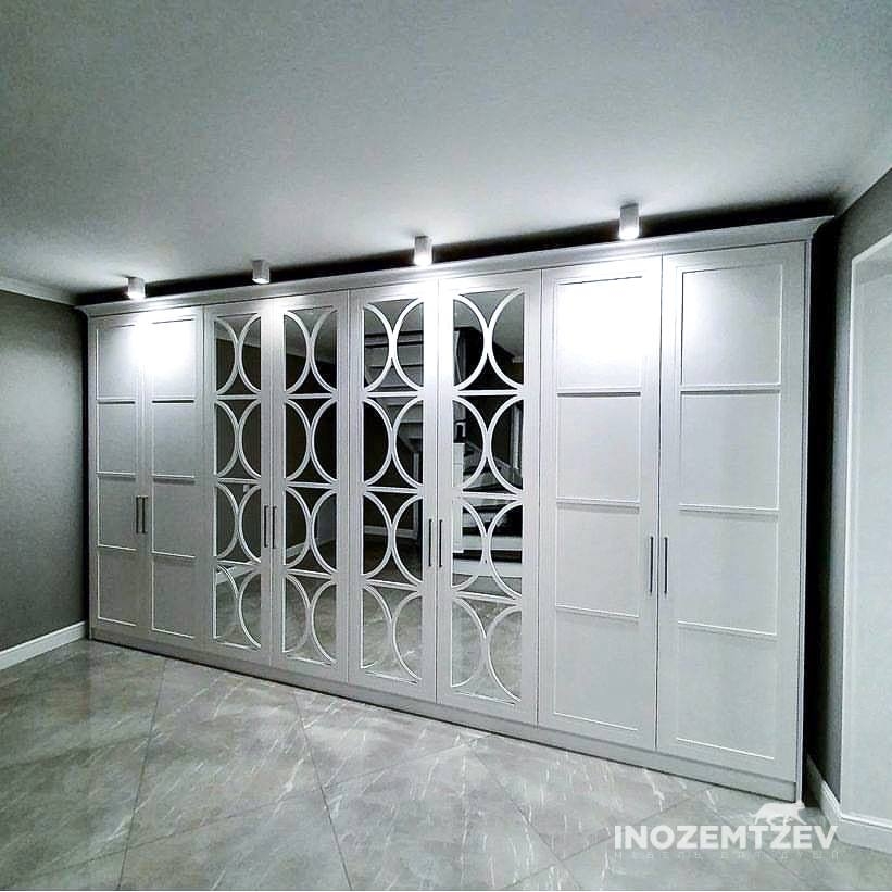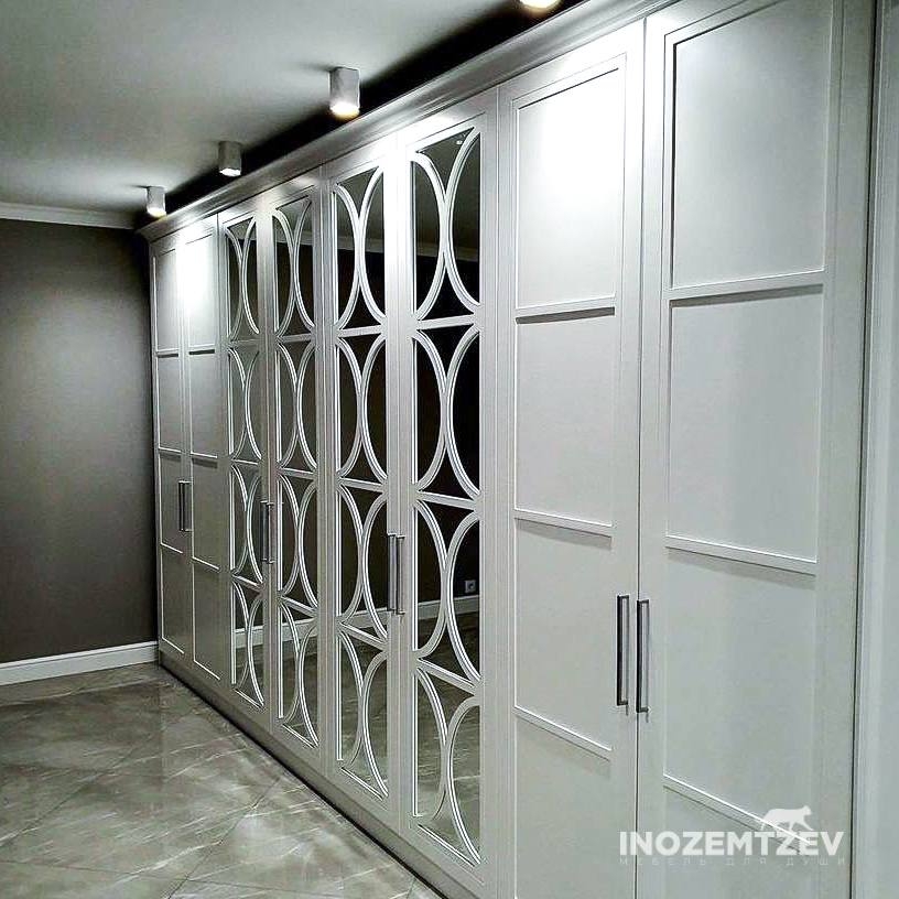 Длинный шкаф в прихожую с МДФ раскладкой на зеркале, выполненный в стиле неоклассика