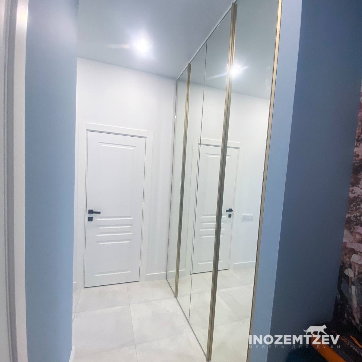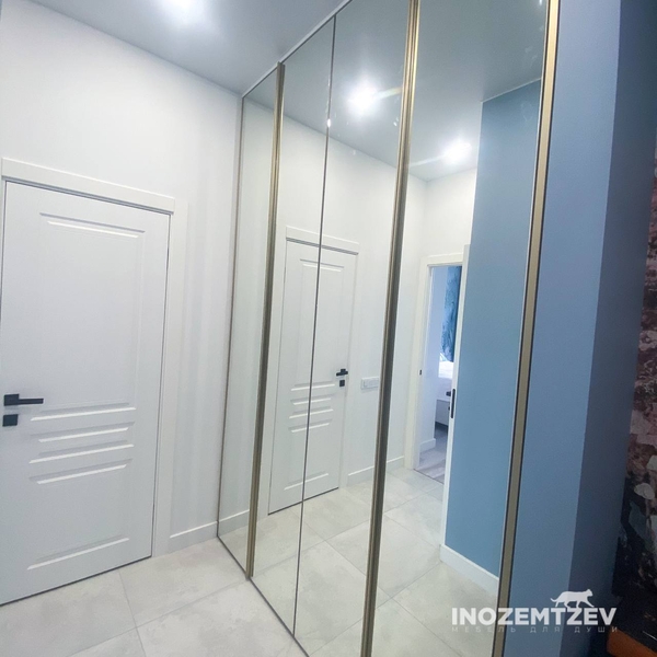 Встроенный шкаф в коридор с распашными зеркальными дверями в брашированном золотом профиле