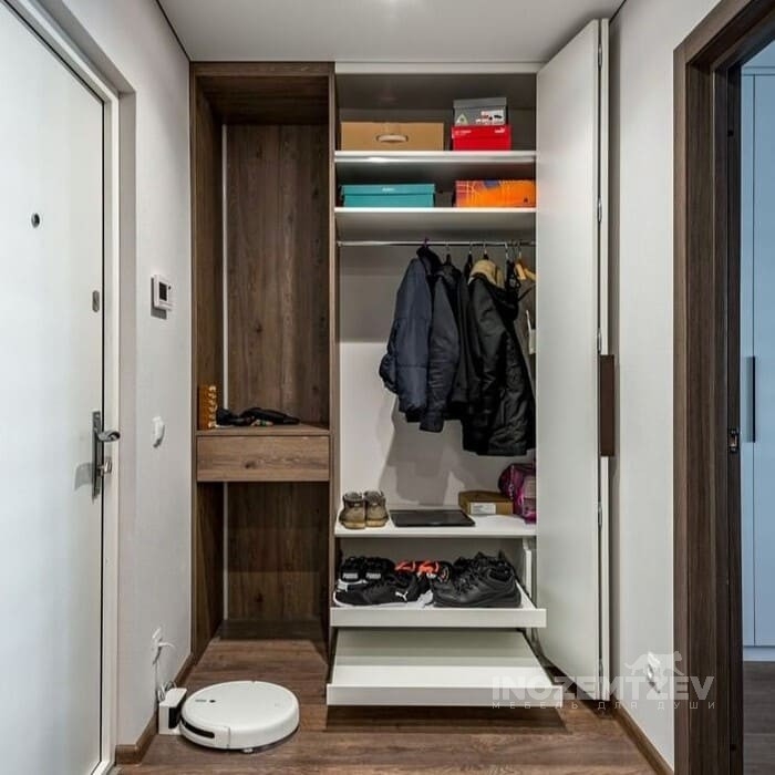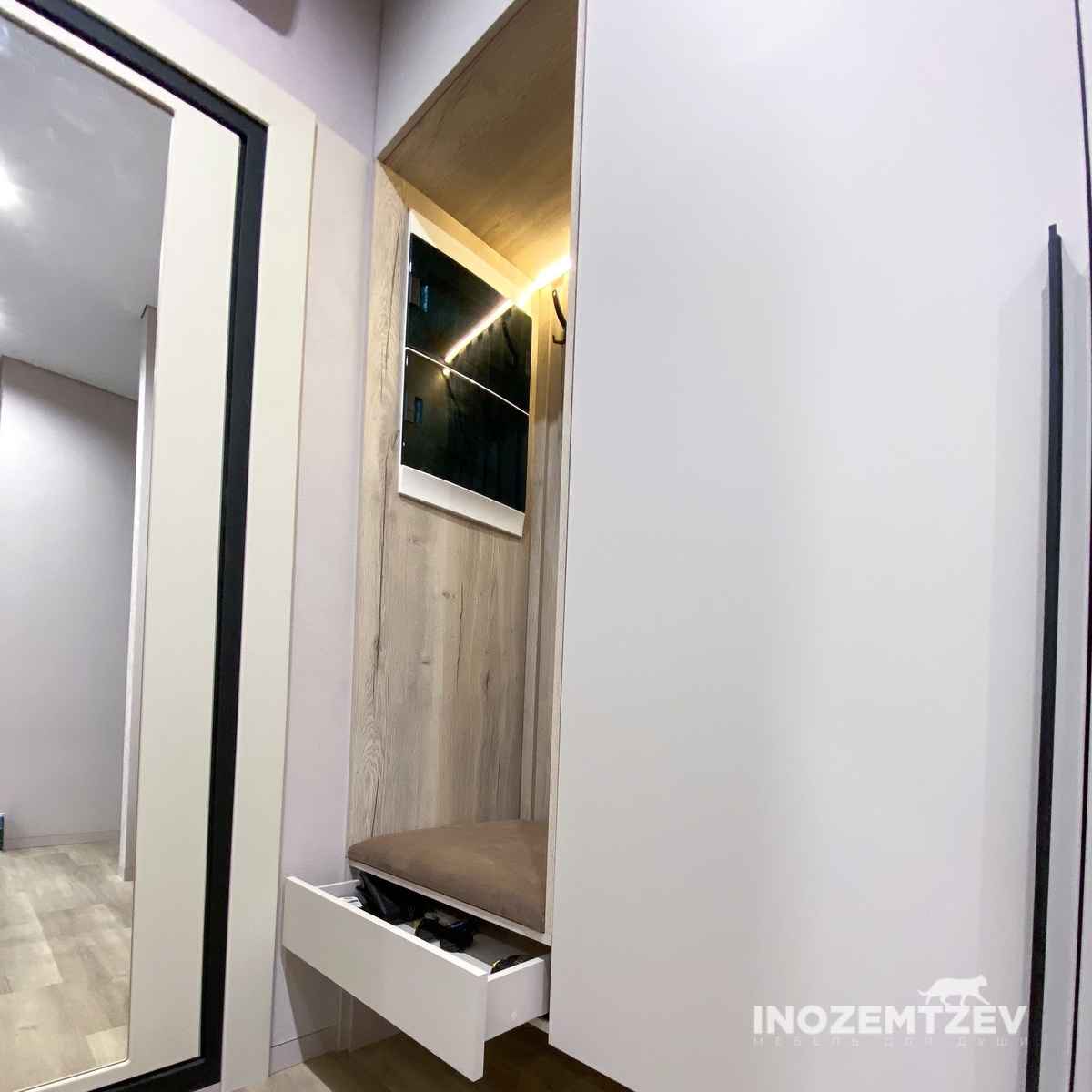 Небольшой шкаф в прихожую с выдвижными ящиками и подсветкой в комбинации нескольких цветов