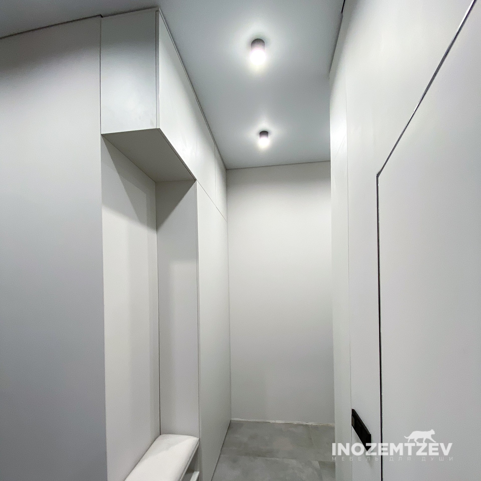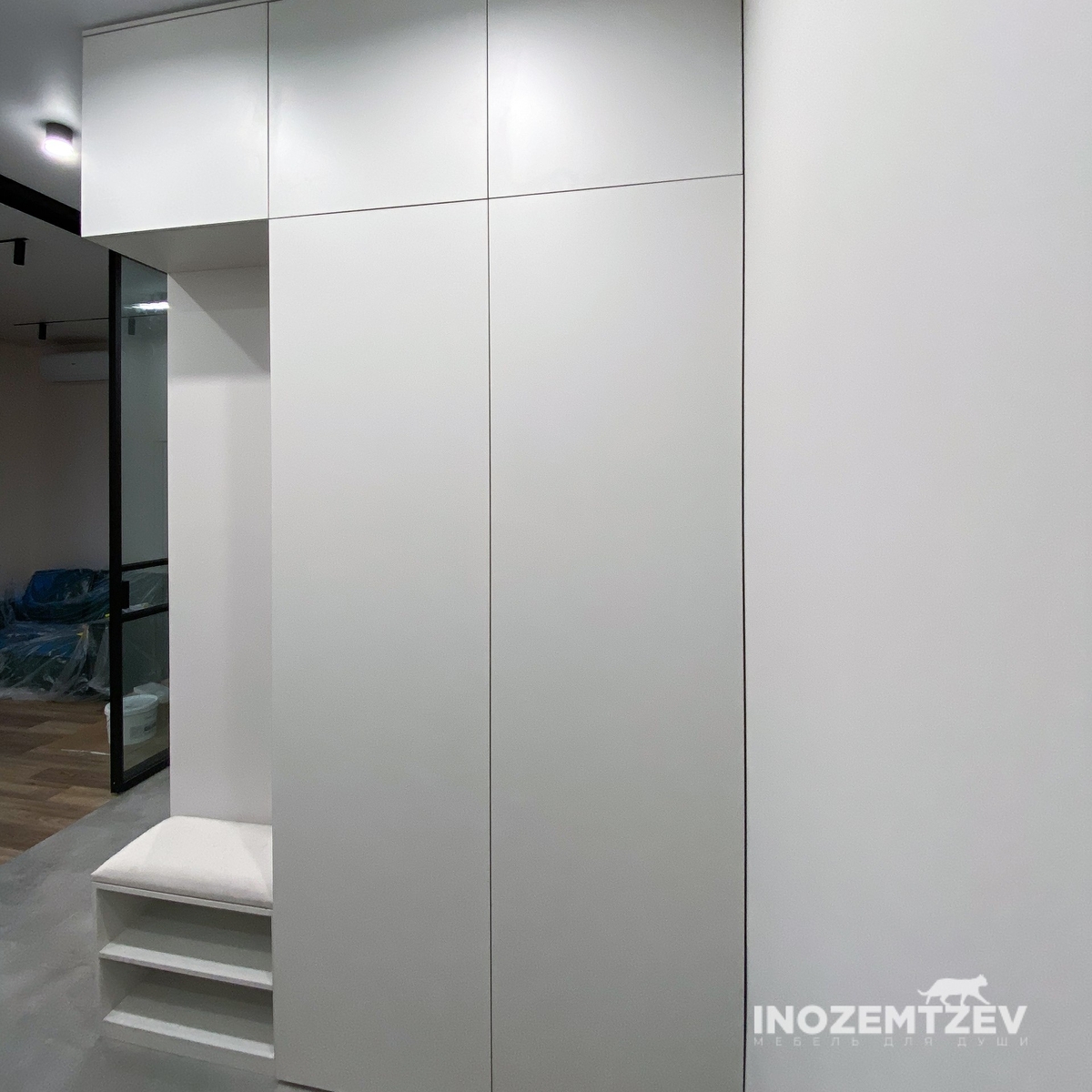 Линейный шкаф в потолок в прихожей из МДФ эмали и ЛДСП Egger, в дополнении к шкафу изготовлены подвесная тумбочка с двумя выдвижными ящиками, вешалки, пуфик, рейки и зеркало