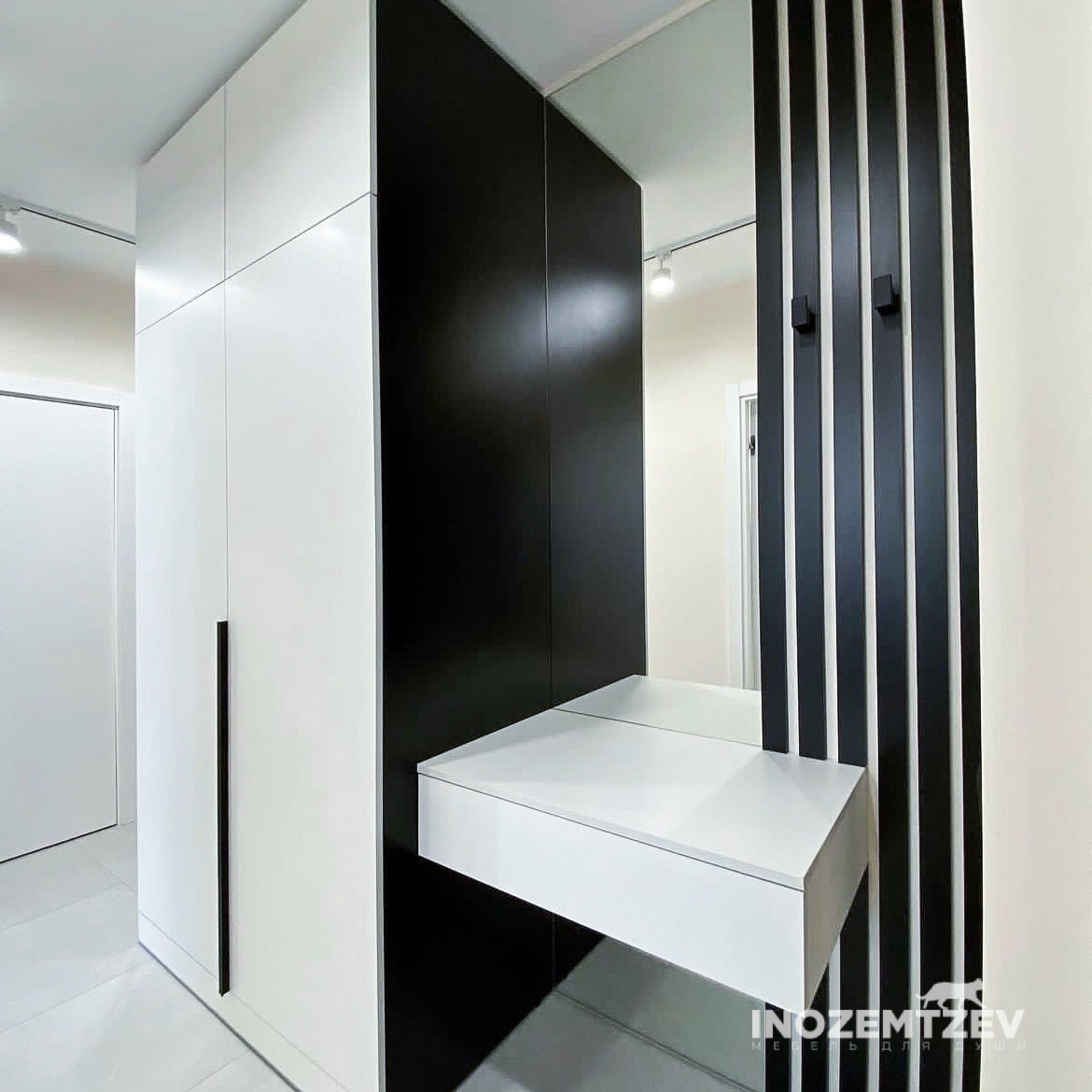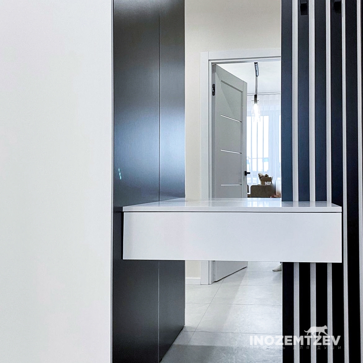 Распашной шкаф с интегрированными ручками, консолью и обувницей - стильной решение для интерьера прихожей