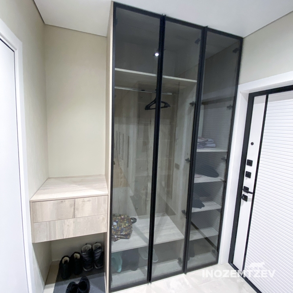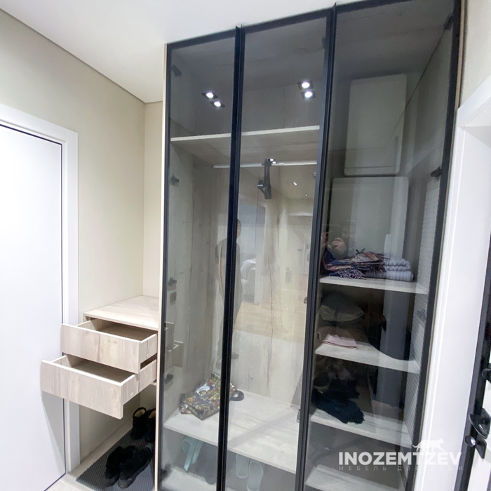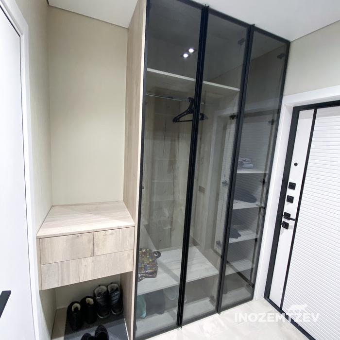 Шкаф для одежды и обуви в прихожую и консоль. Фасадная часть: алюминиевый профиль черный матовый со вставками из стекла grey. Корпус и наполнение: ЛДСП Egger Дуб Галифакс белый