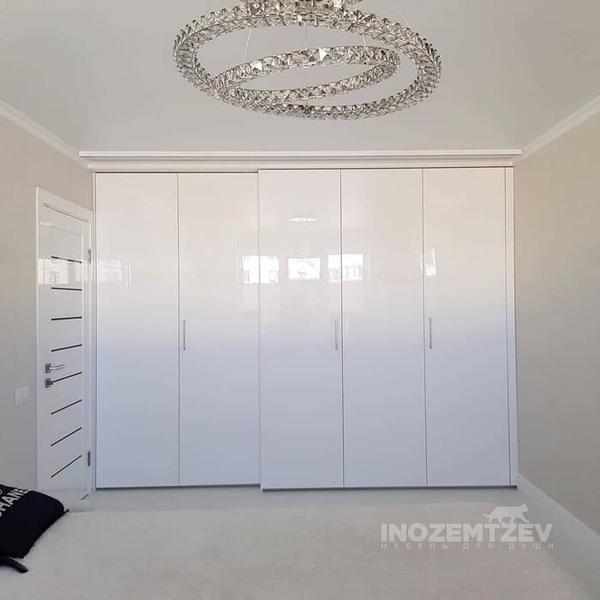 Шкаф гармошка во всю стену в два уровня с глянцевыми дверями
