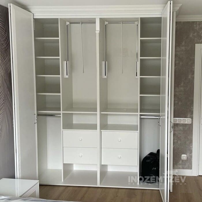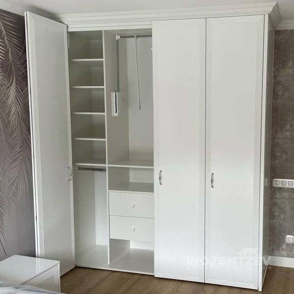 Шкаф гармошка со складными дверями. Размеры: 2830х1492х596 мм. Фасадная часть выполнена из МДФ эмали. Наполнение: штанги, полки, ящики