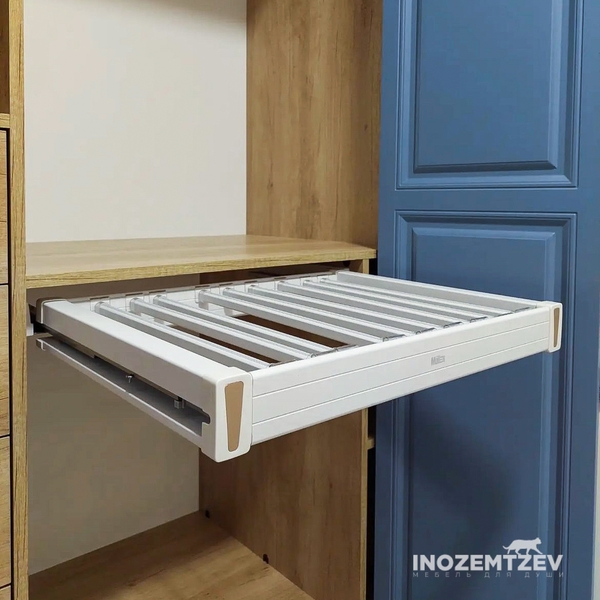 Узкий шкаф со складными дверями от пола до потолка с выкатной брючницей, выдвижными ящиками, штангами.