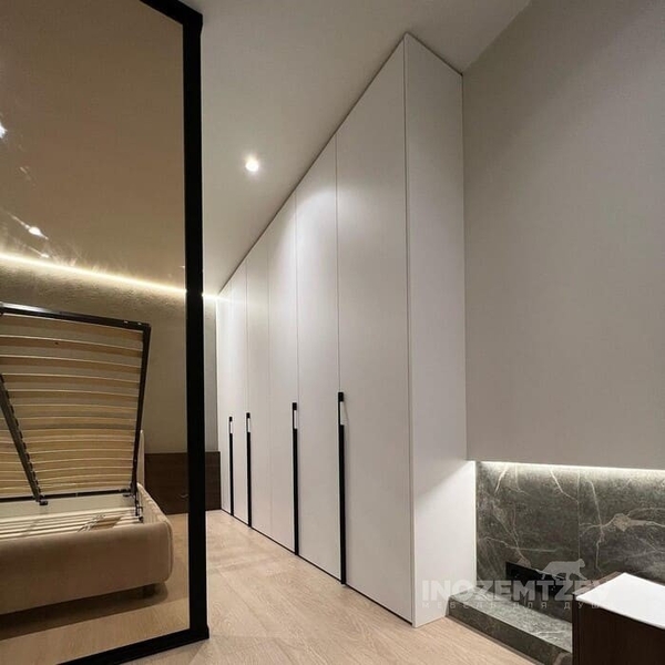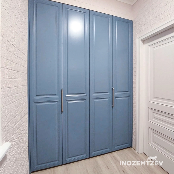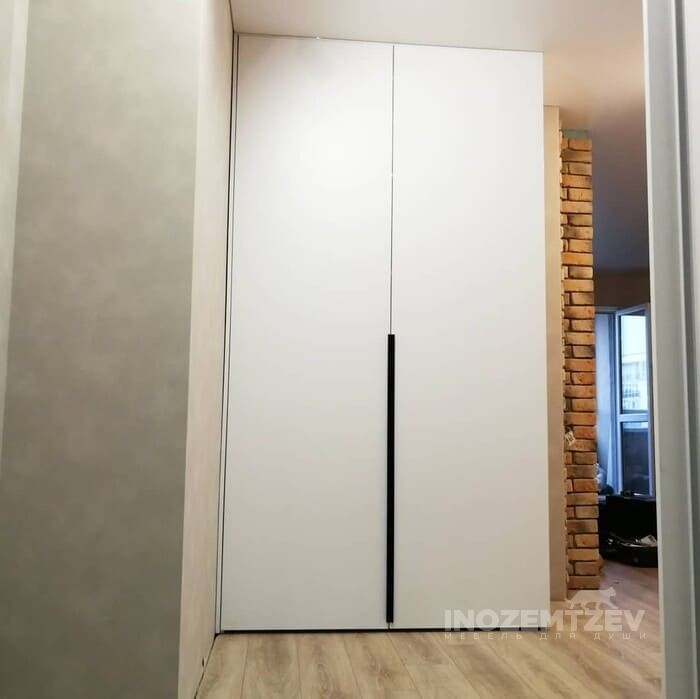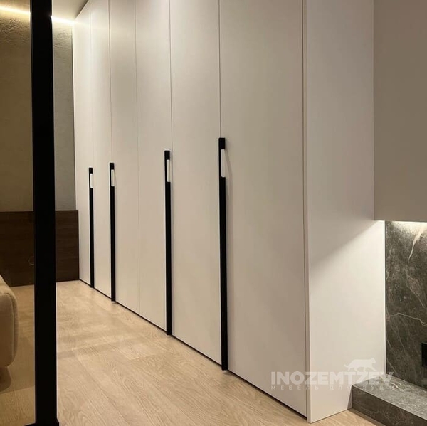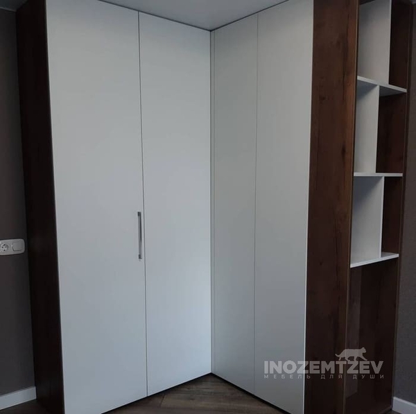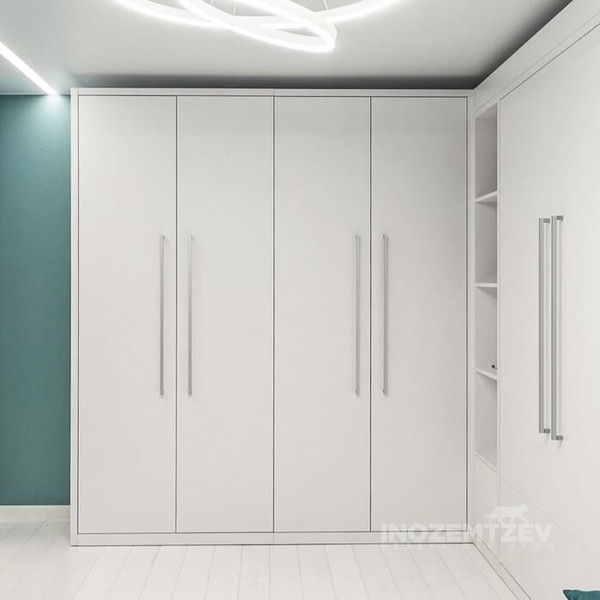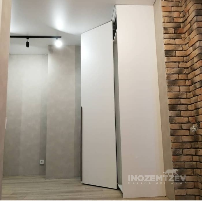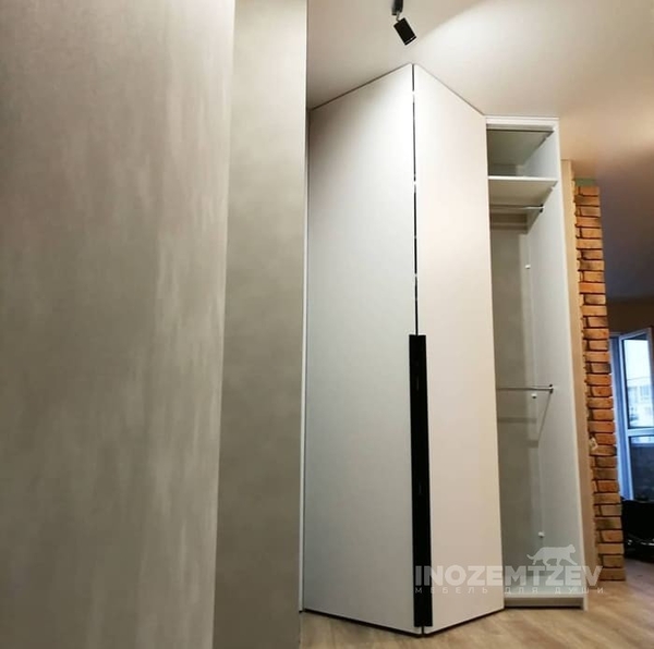 Угловой складной шкаф в комбинации с распашными дверями и рейлинговыми ручками