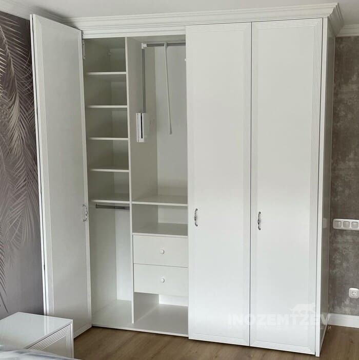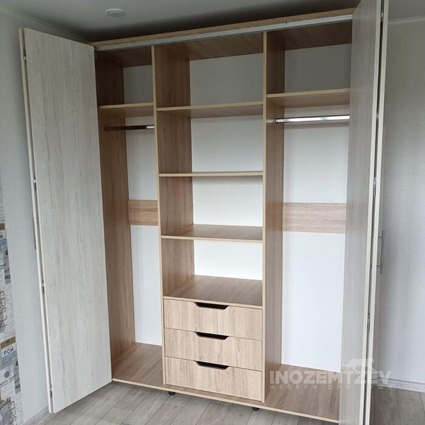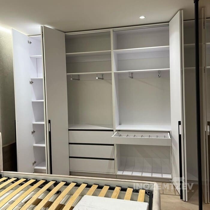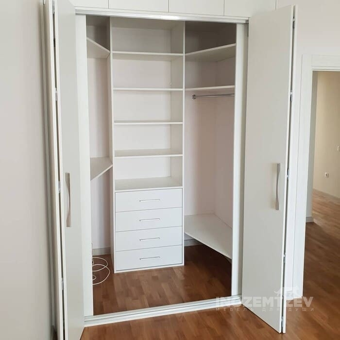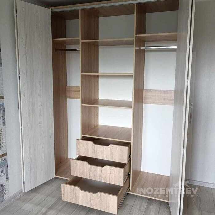 Шкаф гармошка из МДФ с фрезеровкой и текстурным ЛДСП Egger. Наполнение: полки для одежды и обуви, выдвижные ящики с ручками-улыбками, брючница