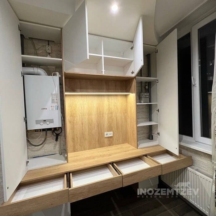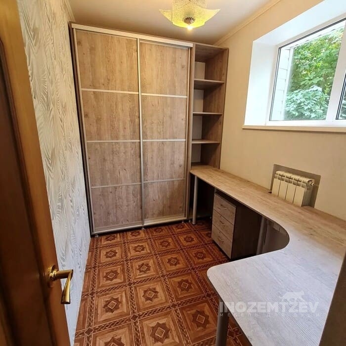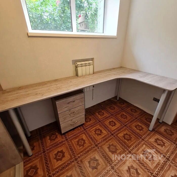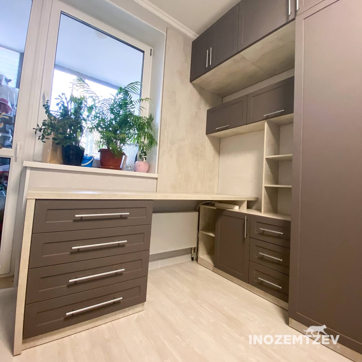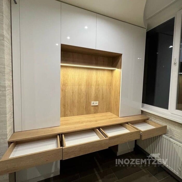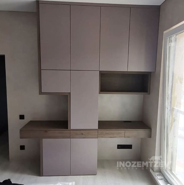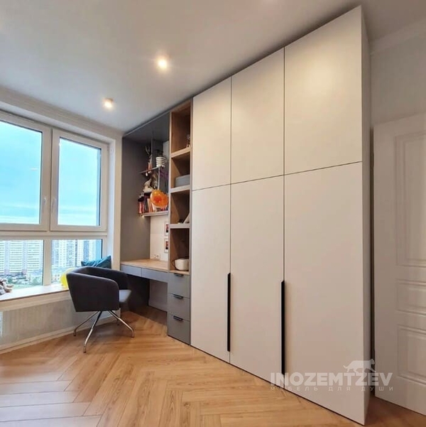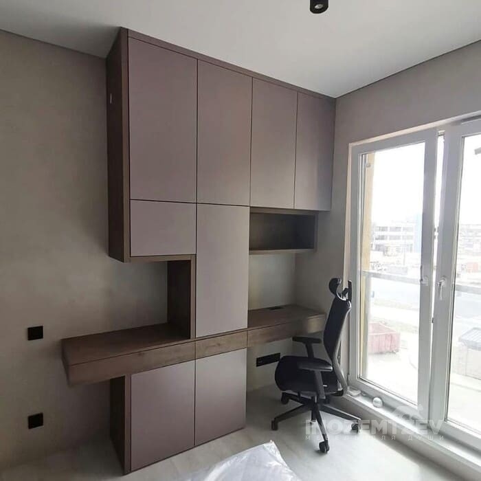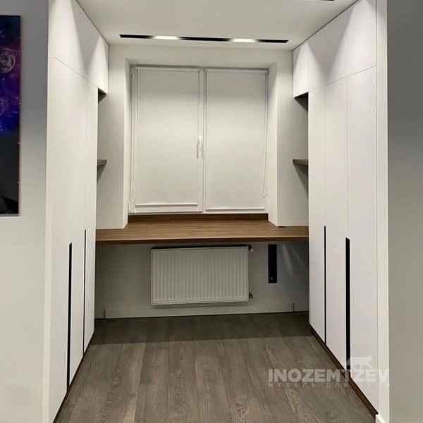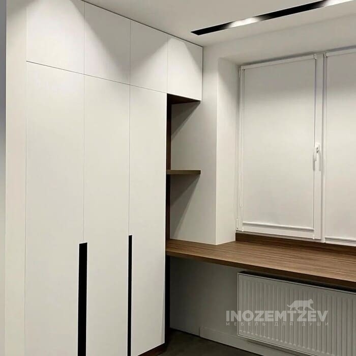 Стол у окна между шкафами с накладными ручками и антресольками