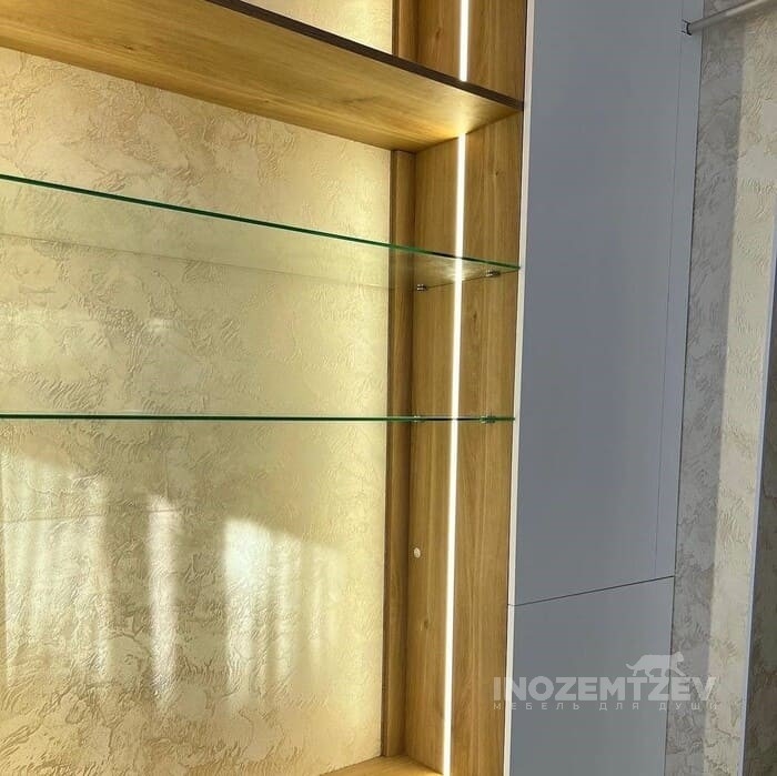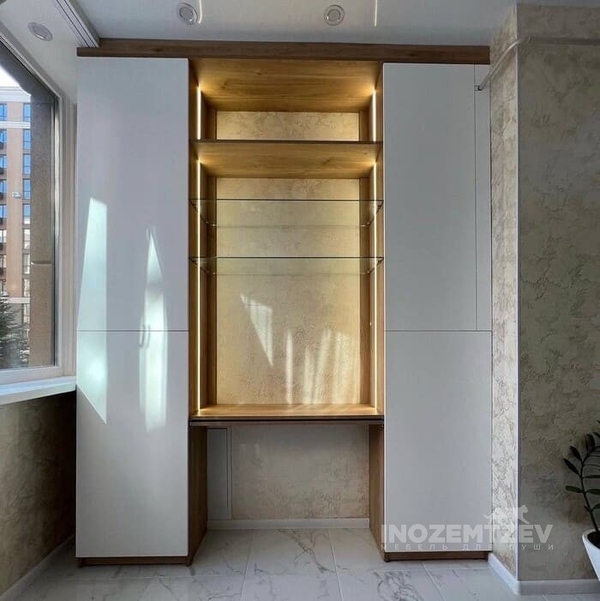 Рабочее место у окна со шкафами со стеклянными полками и подсветкой