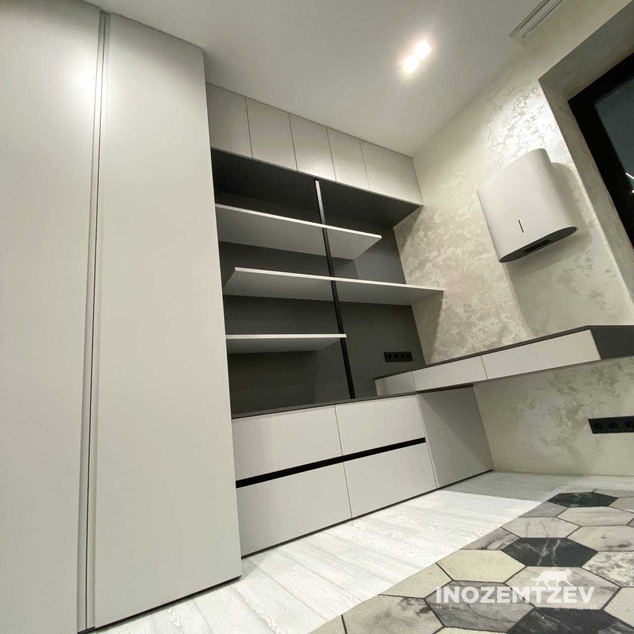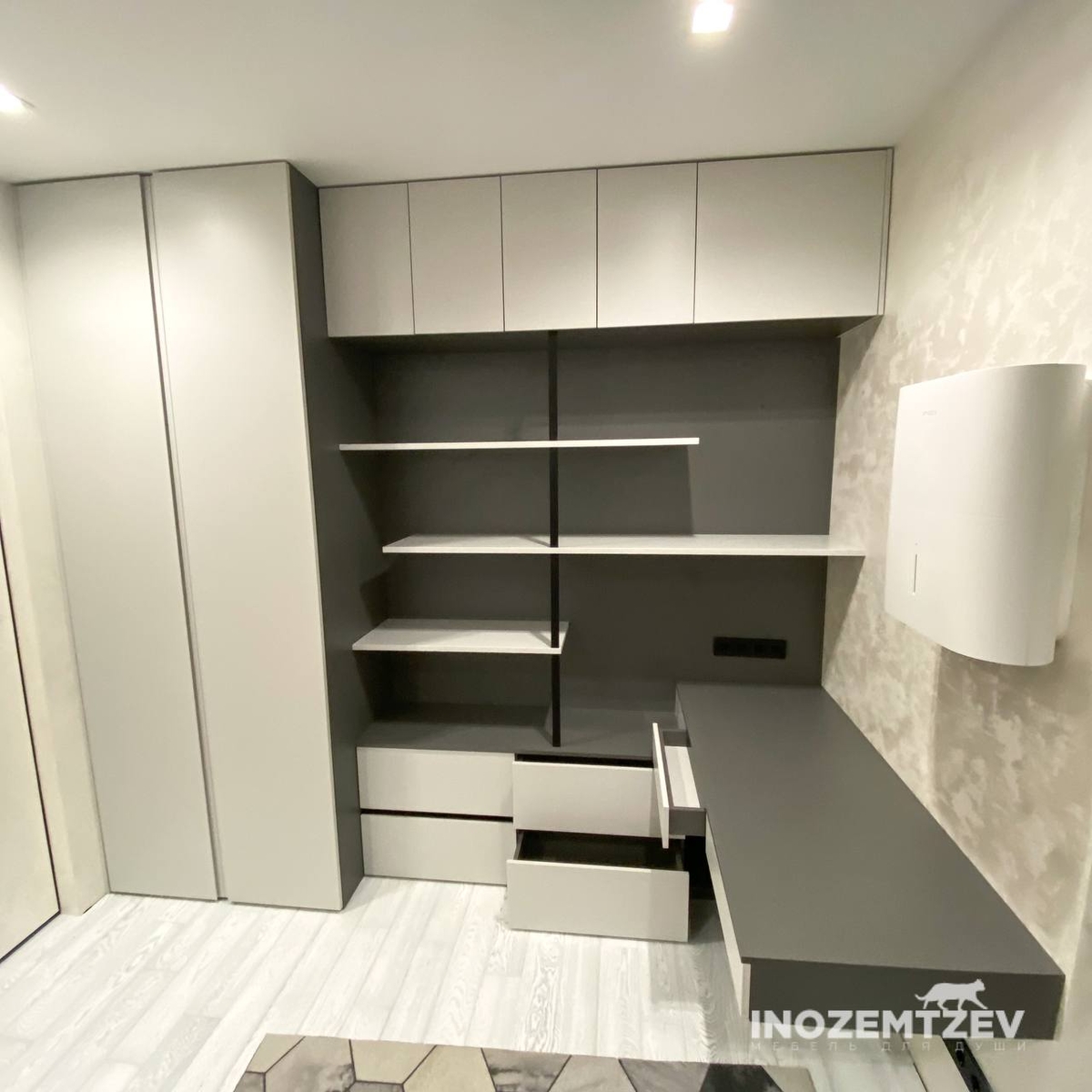 Мебель в домашний кабинет: стенка со столом. Фасадная часть выполнена из МДФ эмали, корпус: ЛДСП Egger Оникс серый. Вставки: металлический профиль. Интегрированная ручка у шкафа. Фурнитура Blum