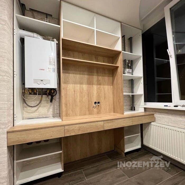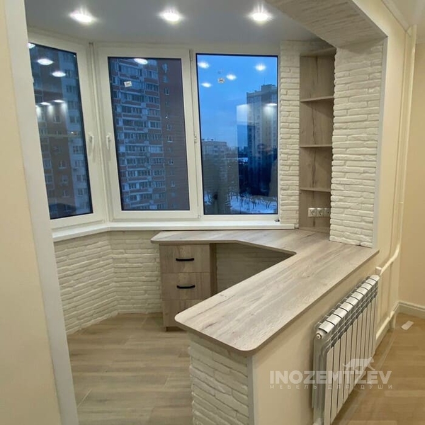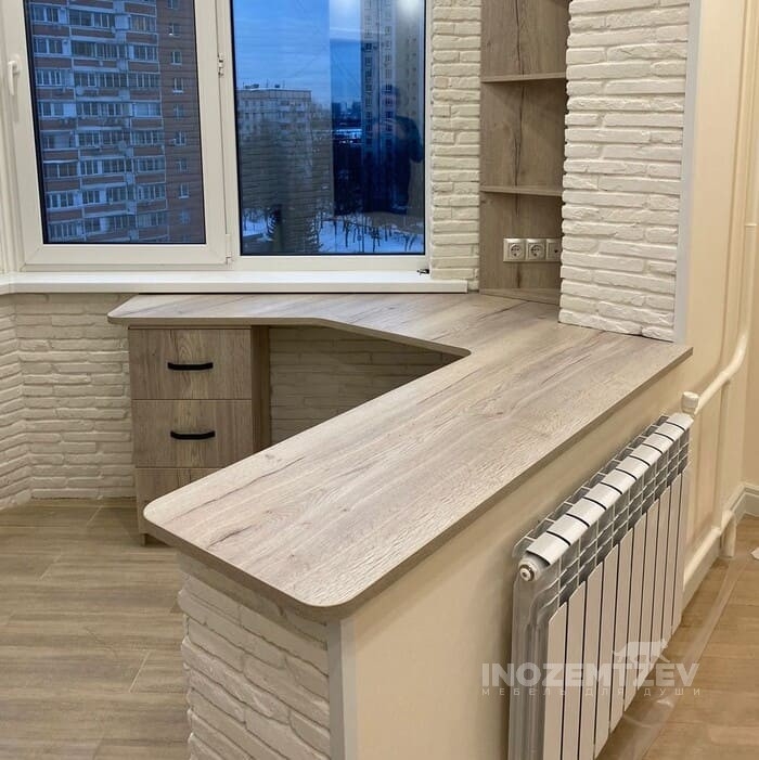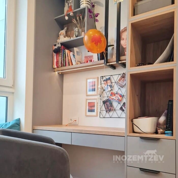 Небольшой открытый стеллаж и стол для кабинета домашнего, расположенного на балконе, материал: ЛДСП Egger