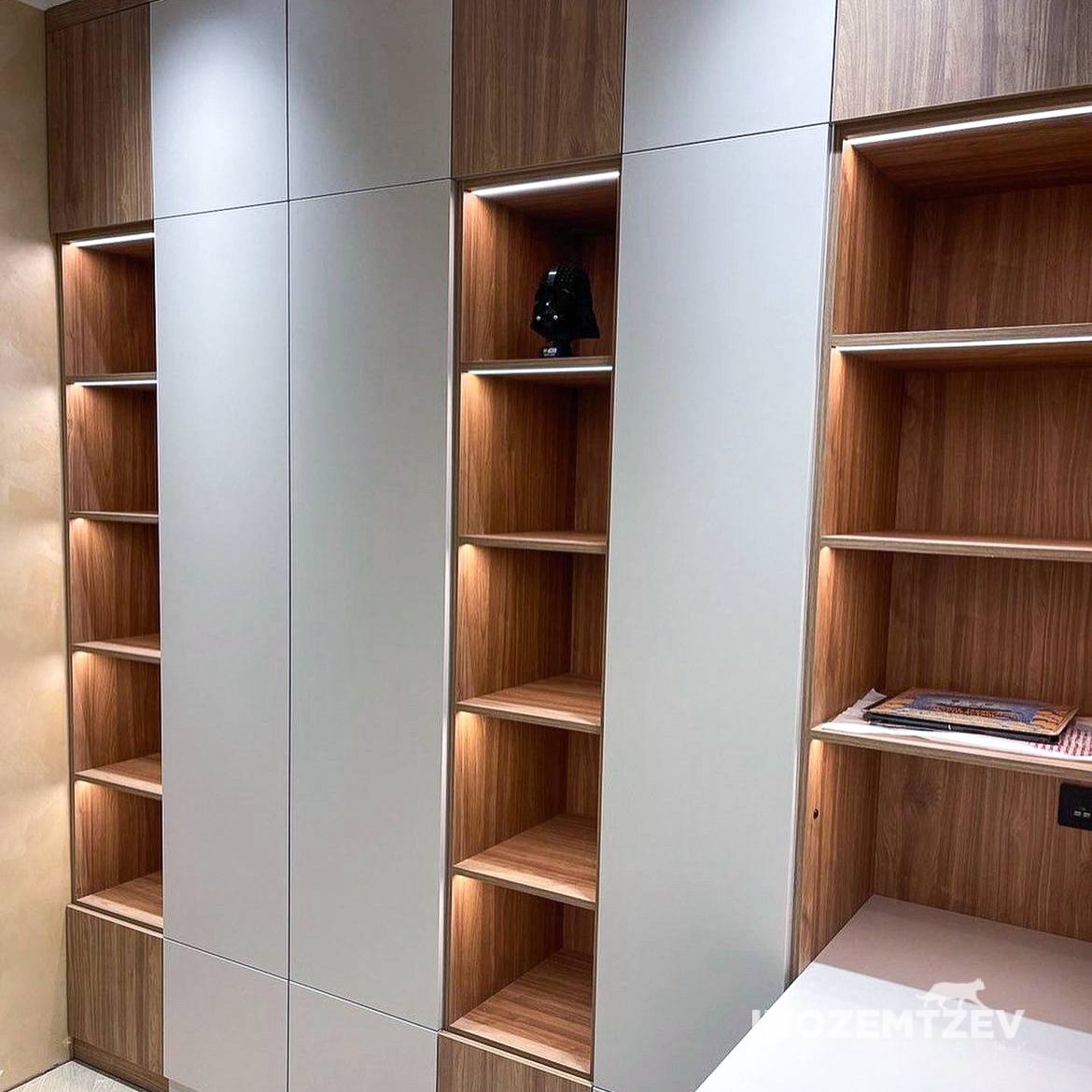 Стол письменный с ящиками, полками с подсветкой, шкафами и антресолями в современном стиле