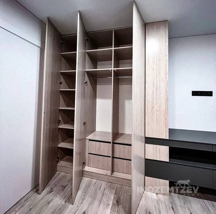Шкафы различаются и по типу открытия дверей. Существуют такие варианты: - распашные двери, классический вариант; - шкаф-купе, идеален для комнат в которых не так много свободного пространства; - гармошка, так же подходит для не самых больших спален. Двери могут быть оборудованы зеркалами, как полностью, так и частично. А могут и вовсе отсутствовать, что, кстати, совсем не редкость, судя по последним тенденциям. При выборе шкафа нужно учитывать не только его внешнюю составляющую, но и внутреннее пространство. С этим аспектом отлично помогает справиться мебель на заказ.