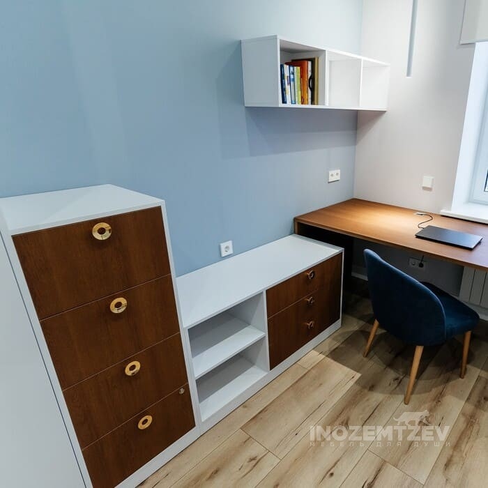 Рабочая зона со шкафом, письменным столом, подвесной тумбой и открытыми полками