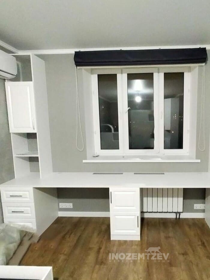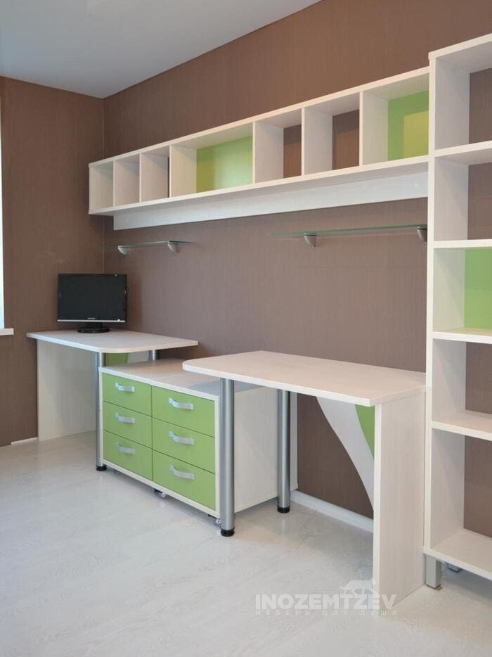 Угловой шкаф в детскую комнату для двоих с письменным столом с надстройкой