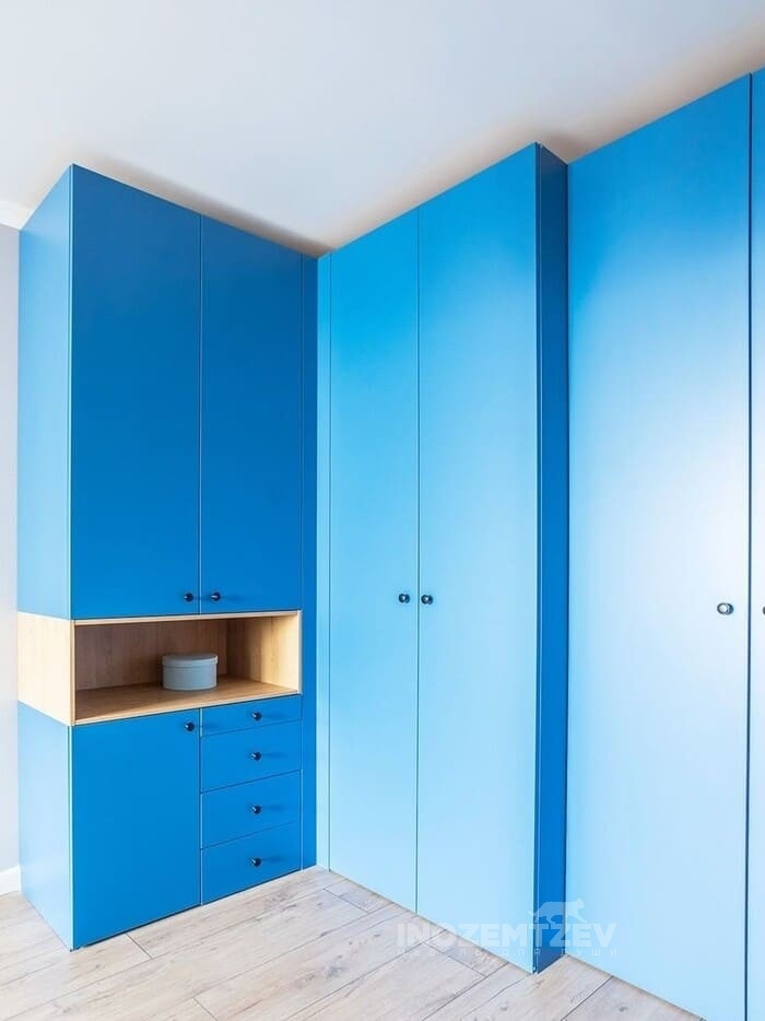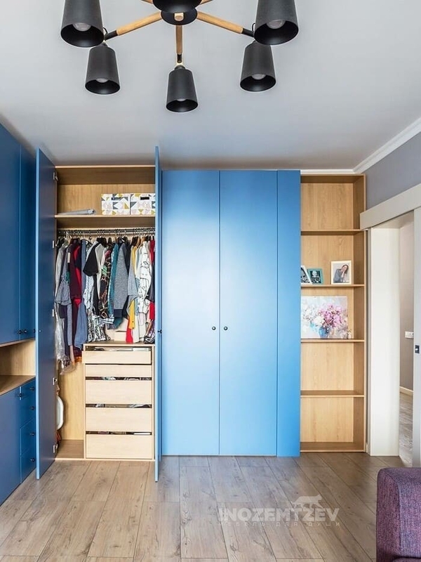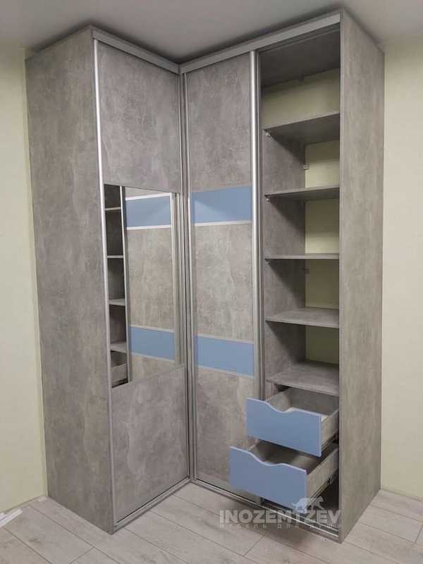 Синий угловой детский шкаф для одежды с текстурными полками