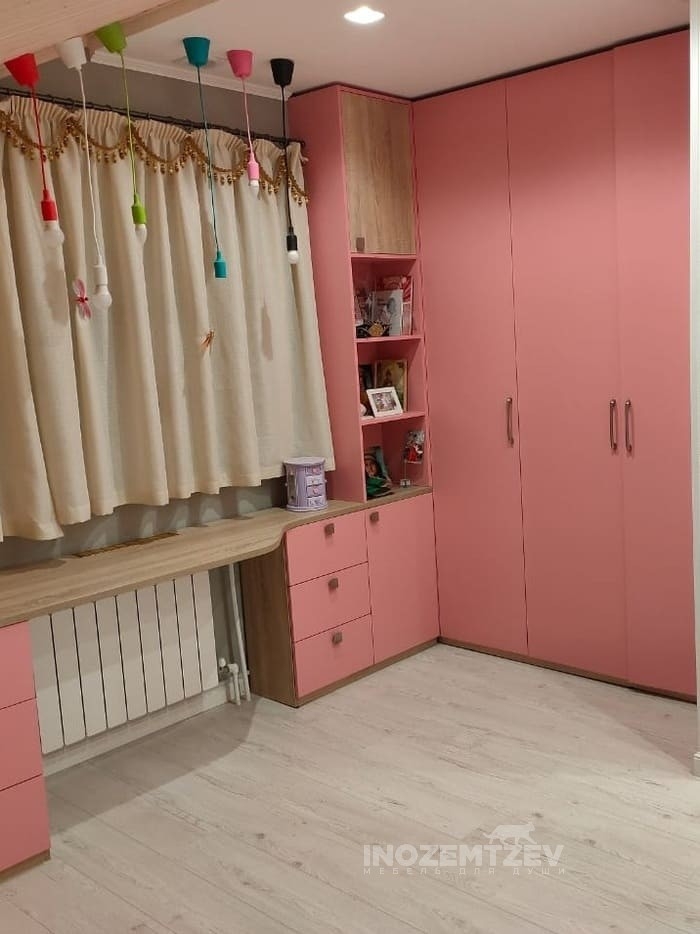 Детская стенка с угловым шкафом в розовом цвете и радиусным столом