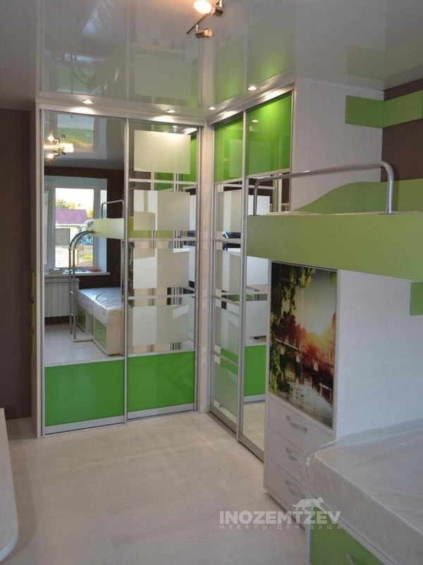 Для мальчика и девочки вместительный угловой шкаф будет центром притяжения: именно здесь — место для хранения игрушек, книг, одежды, принадлежностей для творчества или учебы. Угловой шкаф с детской стенкой обладает особой функциональностью, вмещая в себя целый комплекс с отсеками и ящиками — всем, что подскажет родительская фантазия. Нужно учесть, что выбирать такие шкафы лучше из прочных материалов, обеспечивающих большую долговечность и удобство использования. Конструкция углового шкафа хорошо подойдёт в детскую для двоих детей. По бокам можно разместить отсеки для одежды девочки и мальчика, в середине продумать пенал с полками. Маленьким модницам полюбится вариант углового шкафа с зеркалом, встроенным в фасад, как вариант оформления интерьера, но лучше все же отказаться от чрезмерного использования зеркал в комнатах для детей, в целях их безопасности.