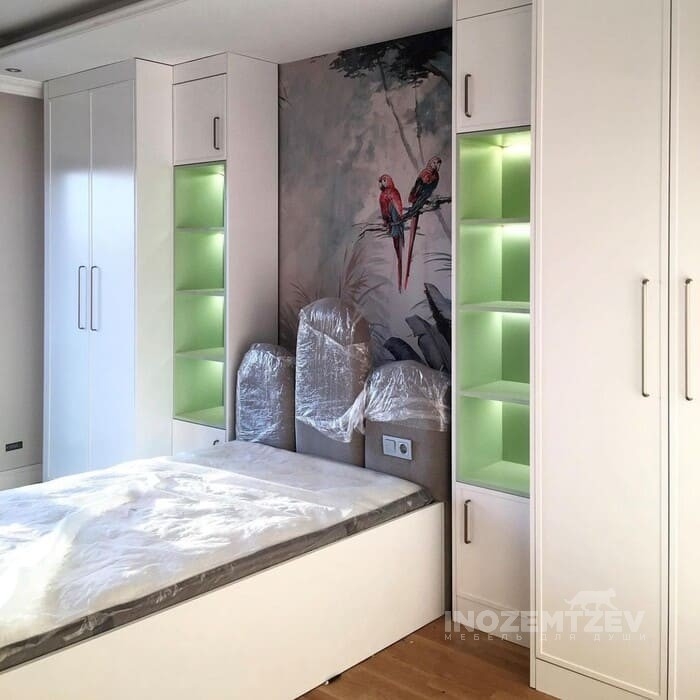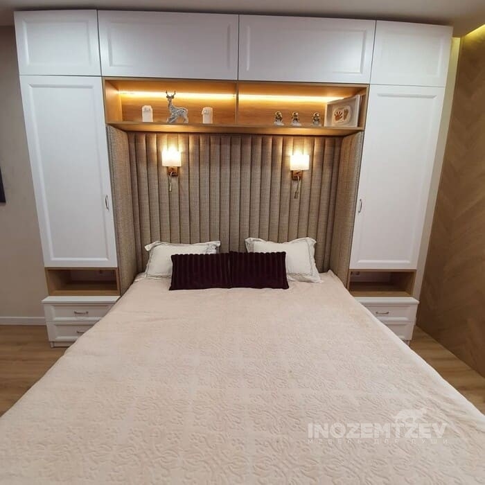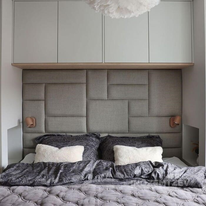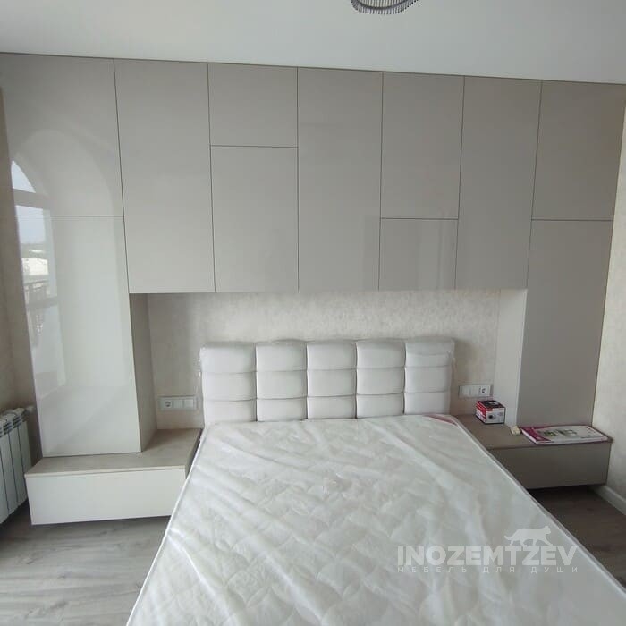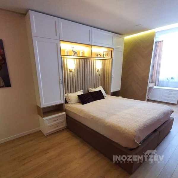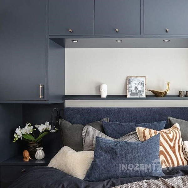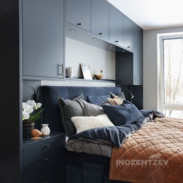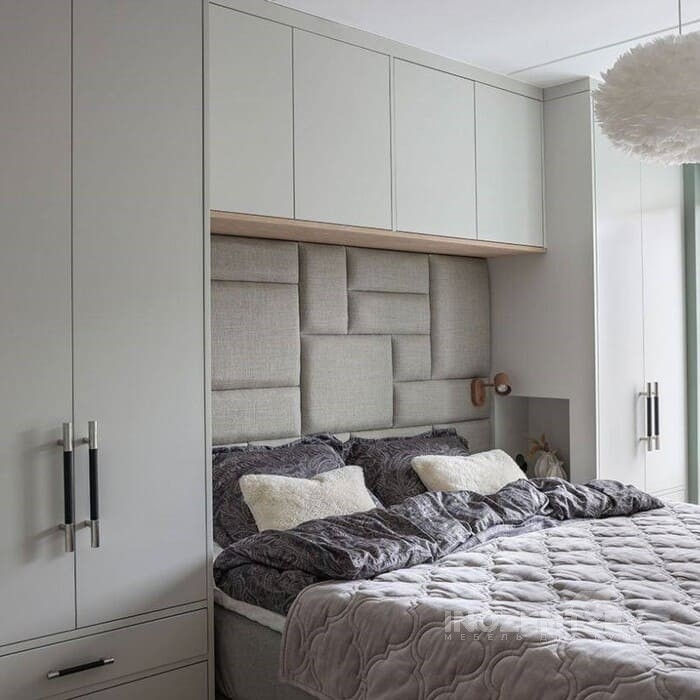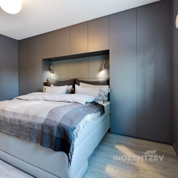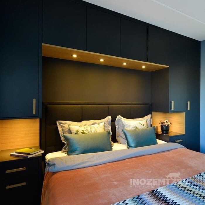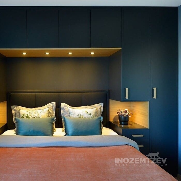 Шкафы устанавливаются по обеим сторонам от изголовья, они могут быть во всю высоту стены, либо с антресолями. Над самой кроватью, обычно, навешивают дополнительные шкафчики или полочки. Однако, некоторые, в целях перестраховки, оставляют это пространство пустым. Идеальный шкаф для вашего интерьера с грамотной организацией пространства легко превращается из мечты в реальность, если за дело берутся настоящие профессионалы.