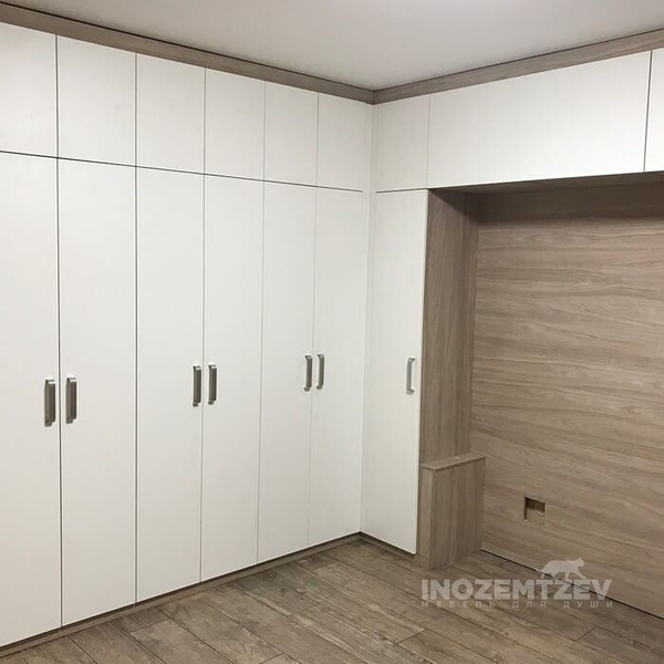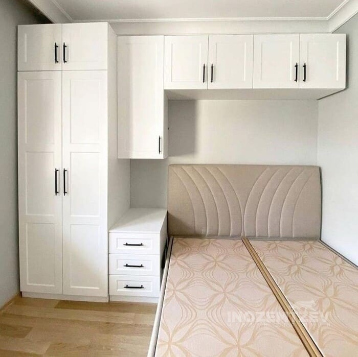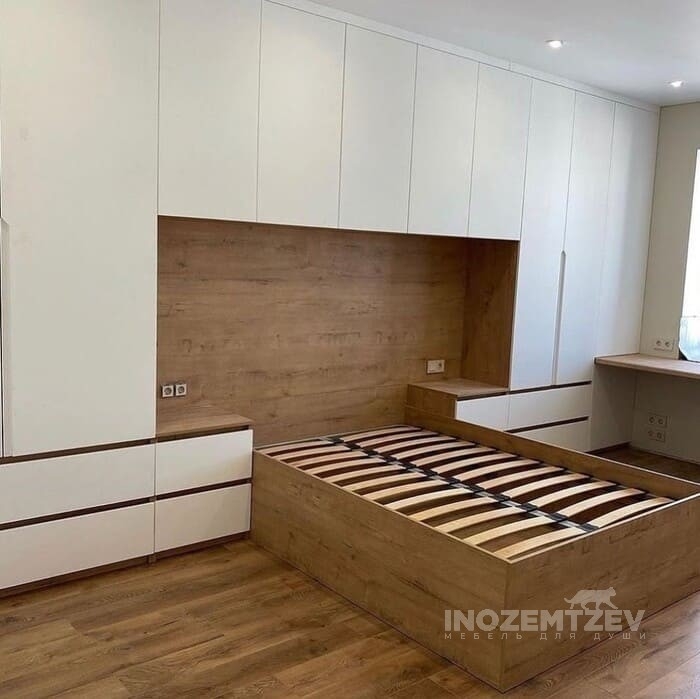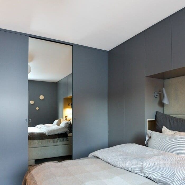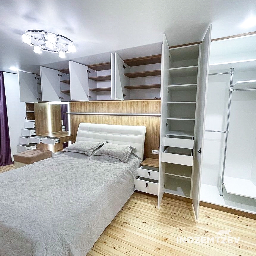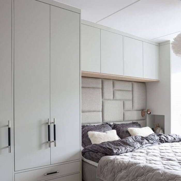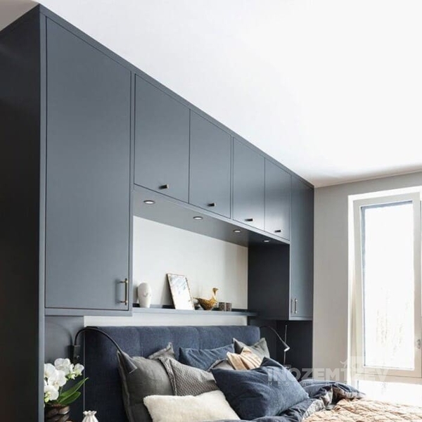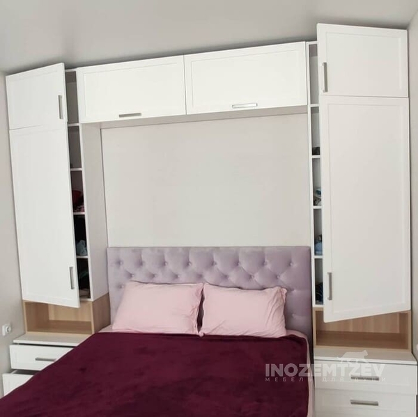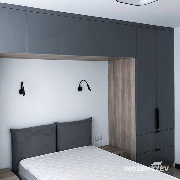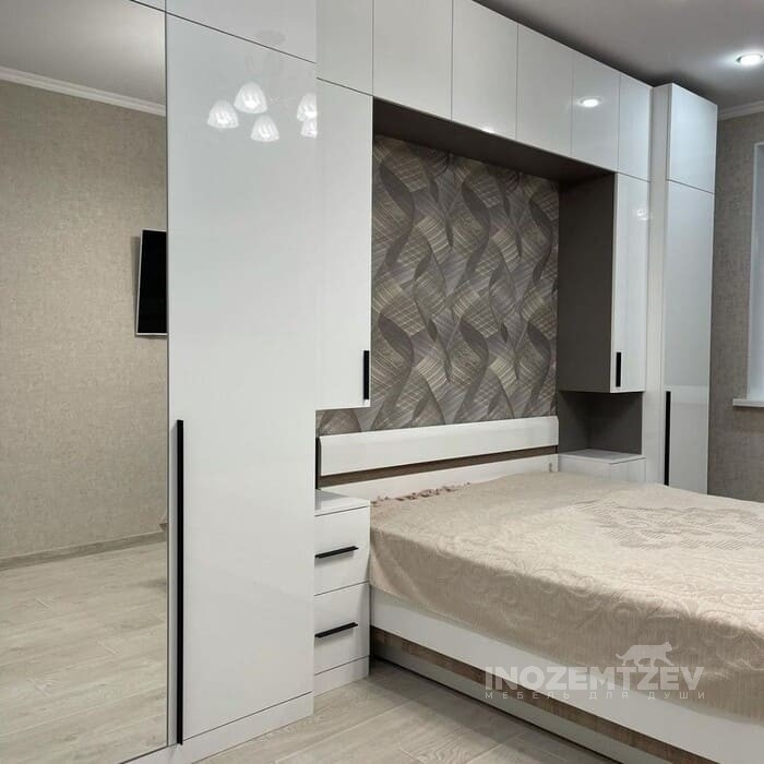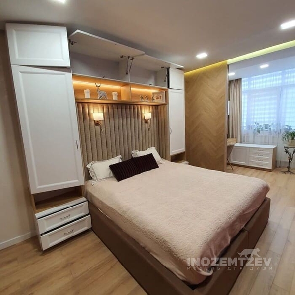 Шкафы устанавливаются по обеим сторонам от изголовья, они могут быть во всю высоту стены, либо с антресолями. Над самой кроватью, обычно, навешивают дополнительные шкафчики или полочки. Однако, некоторые, в целях перестраховки, оставляют это пространство пустым. Идеальный шкаф для вашего интерьера с грамотной организацией пространства легко превращается из мечты в реальность, если за дело берутся настоящие профессионалы.