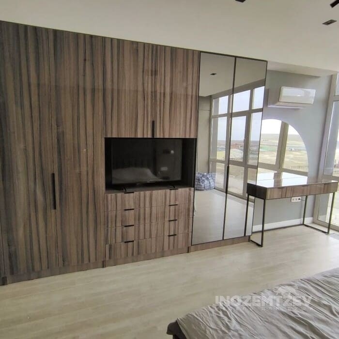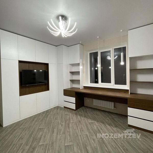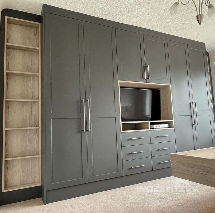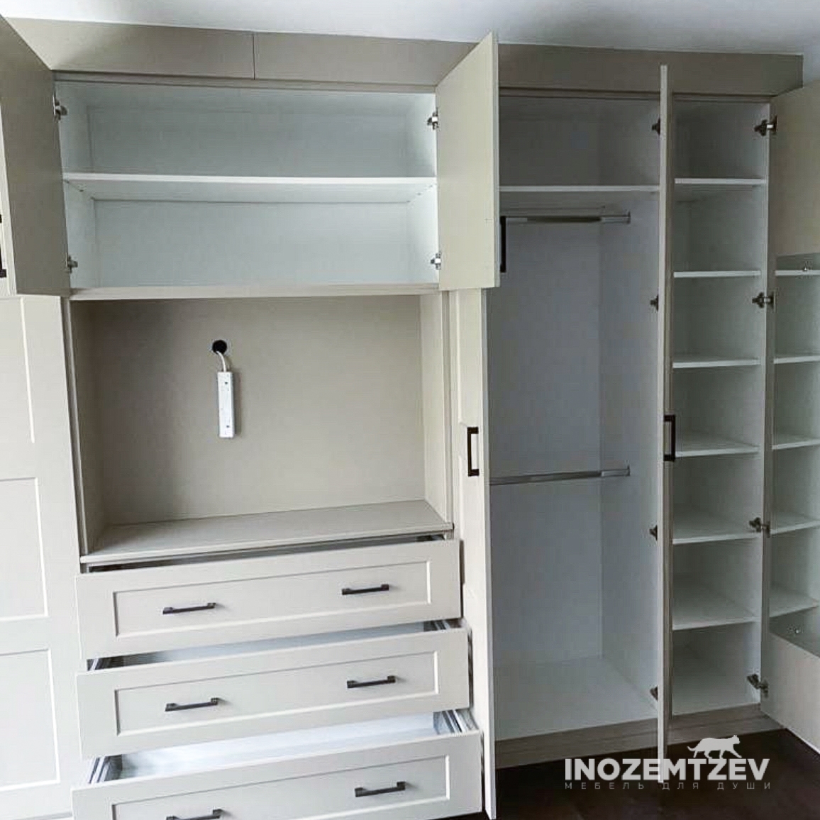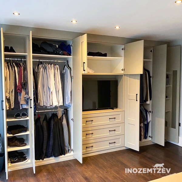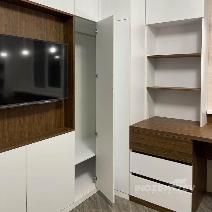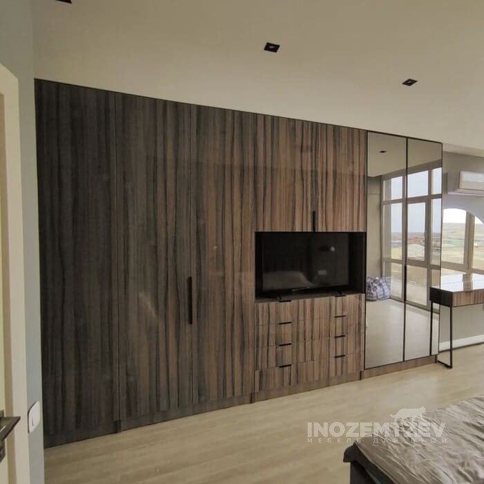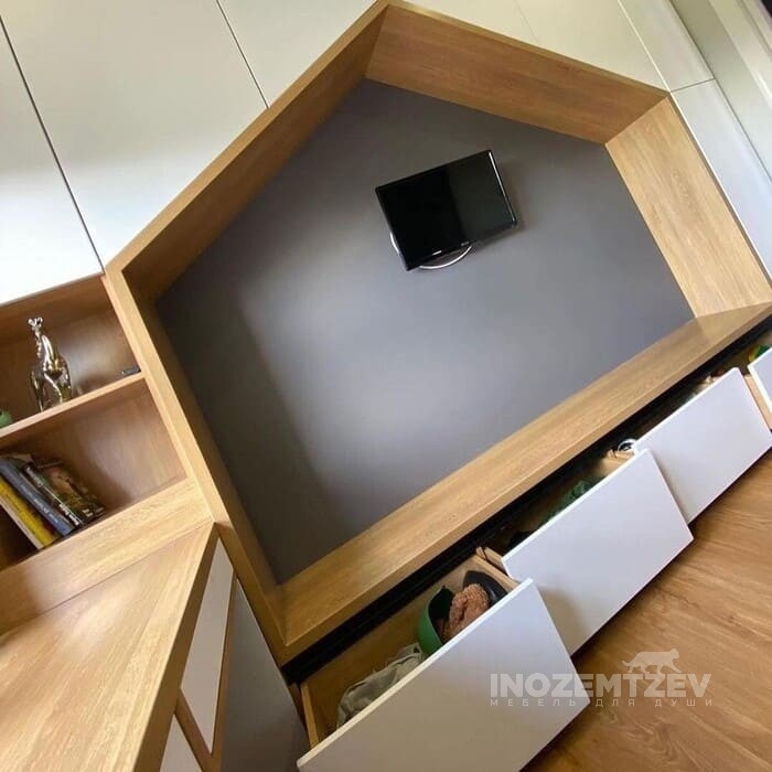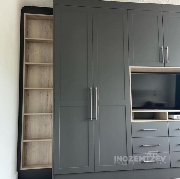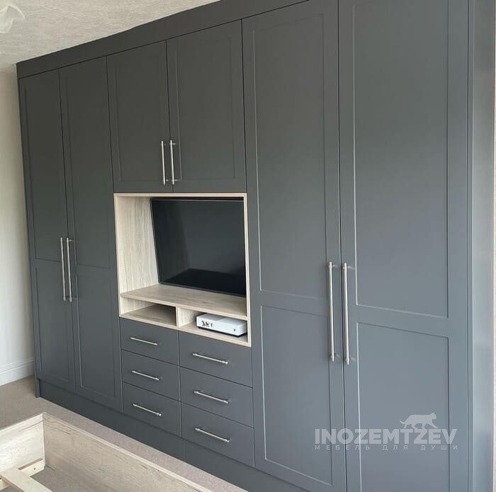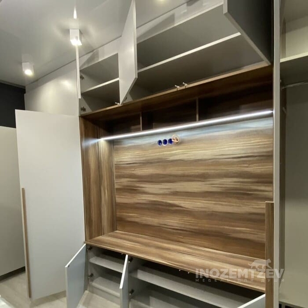 Стенка под телевизор в гостиную с отсеками для одежды и обуви, с антресолью и выдвижными ящиками. Фасадная часть выполнена из МДФ эмали