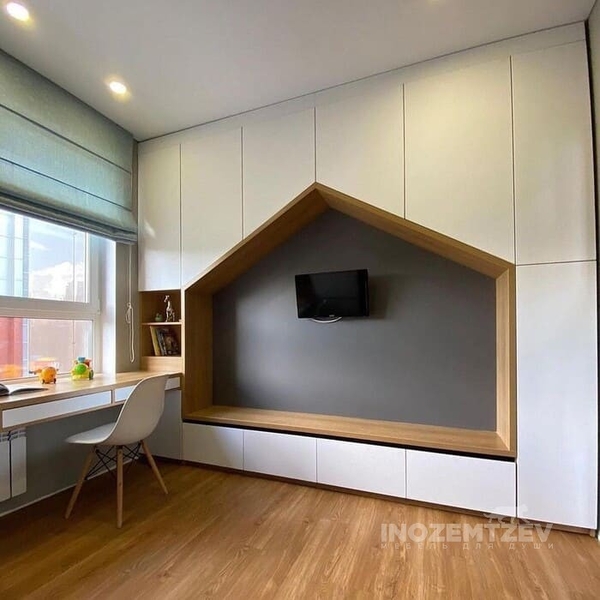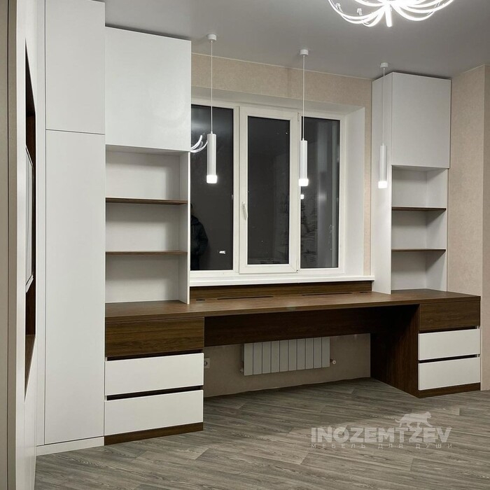 Угловая стенка в гостиную с рабочей зоной вокруг окна в сочетании двух цветов