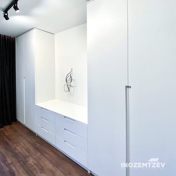 Стенка в гостиную для одежды во всю стену из МДФ эмали и открытых полок из ЛДСП