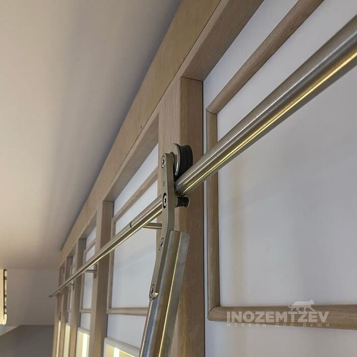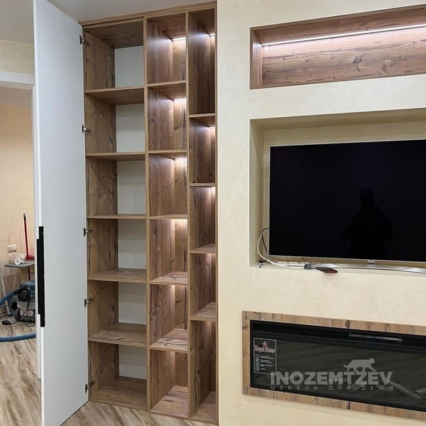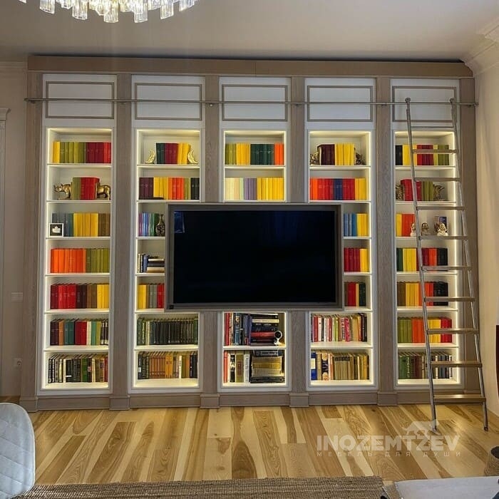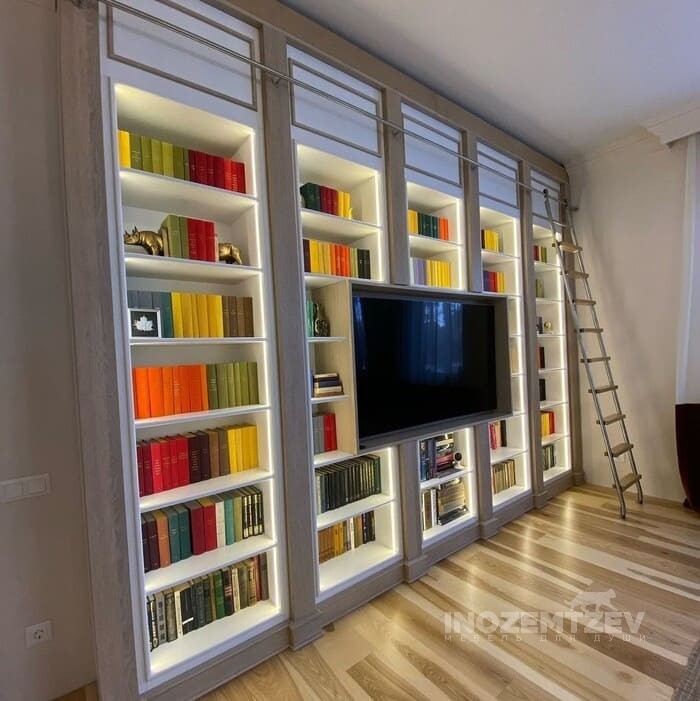 Книжная стенка в гостиную с нишей под телевизор, подсветкой внутри шкафа и мобильной лестницей для удобства