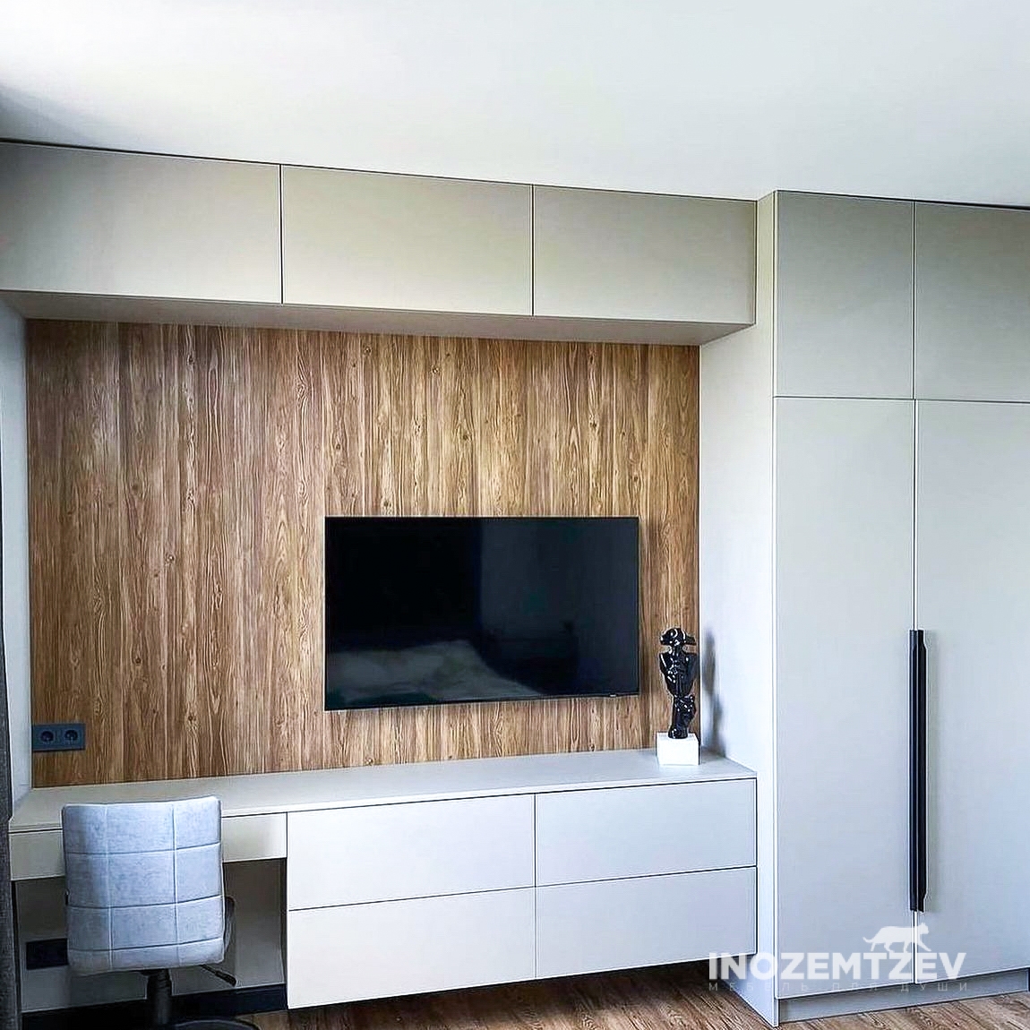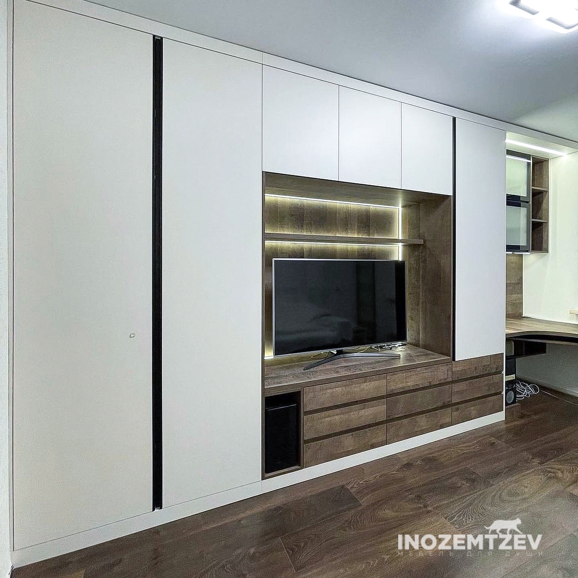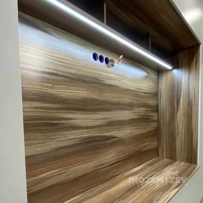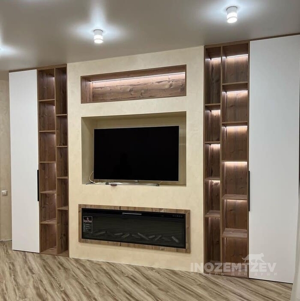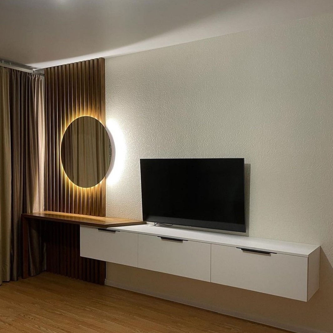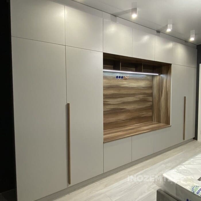 Современная стенка под телевизор в гостиную с подсветкой и накладными деревянными ручками