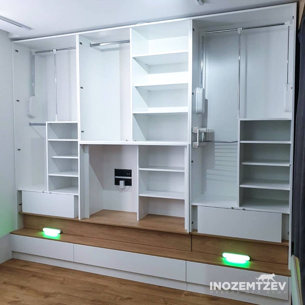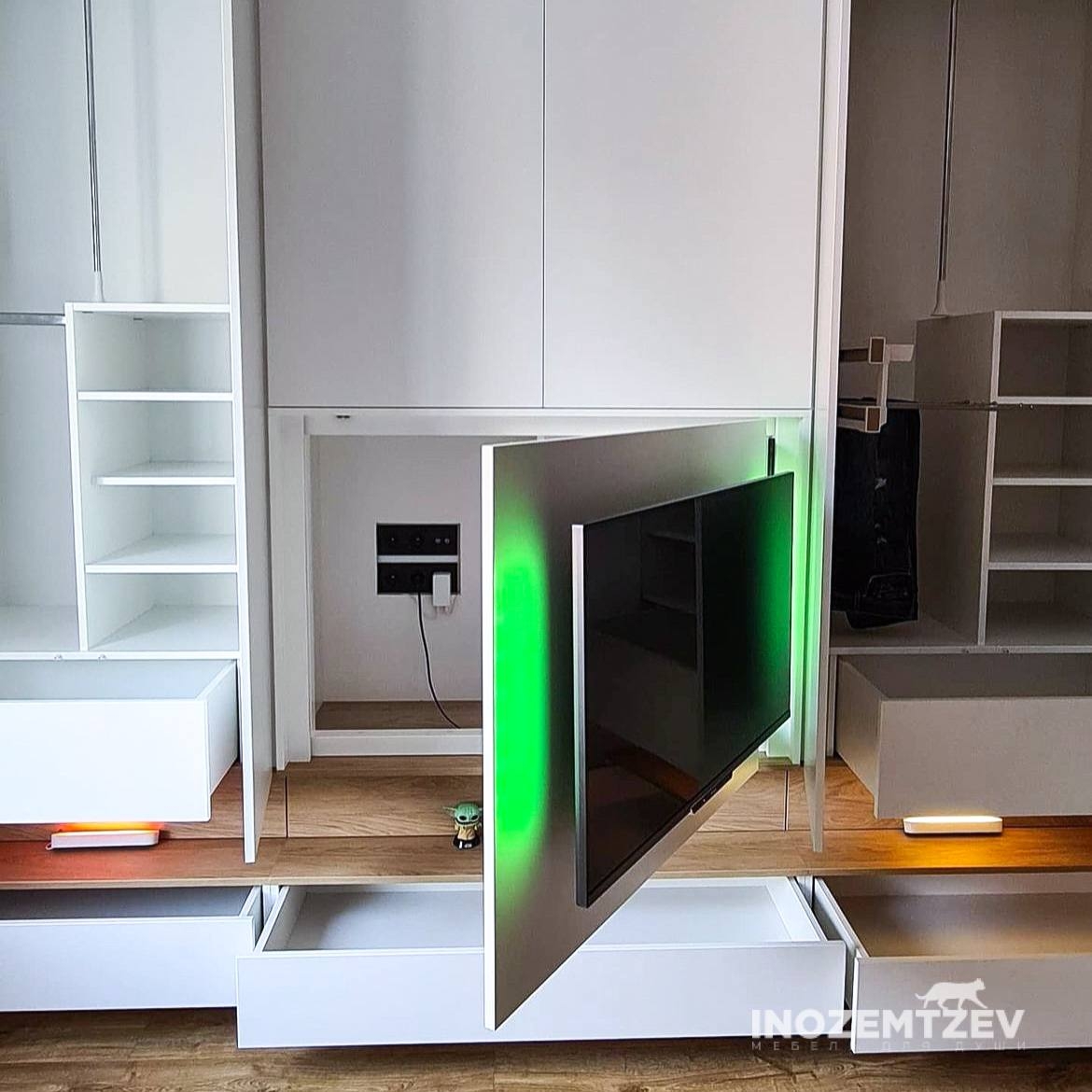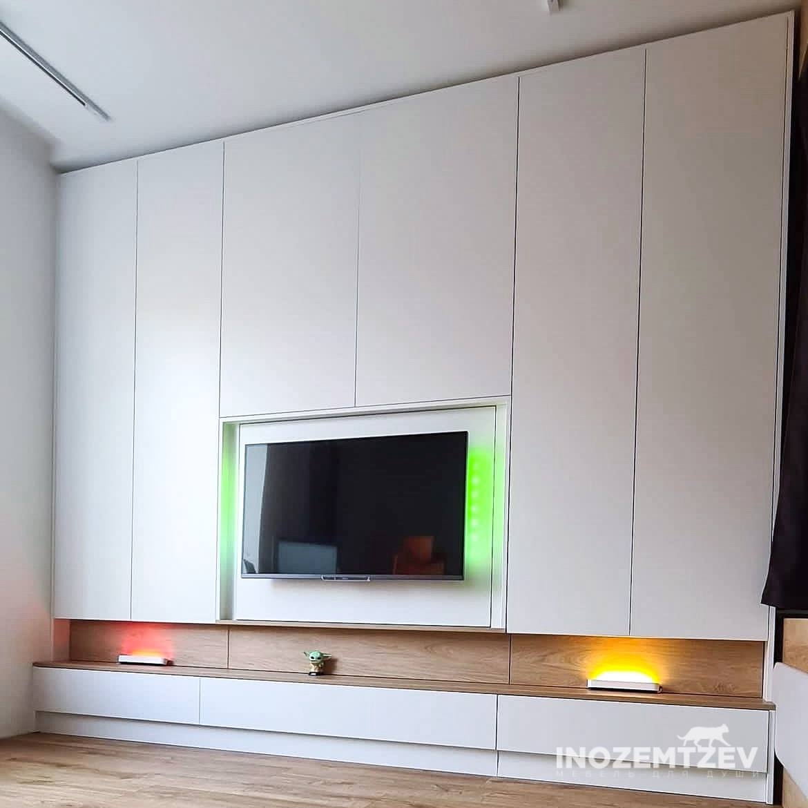 Стенка со шкафами для одежды и телевизором с оригинальной подсветкой в современном стиле