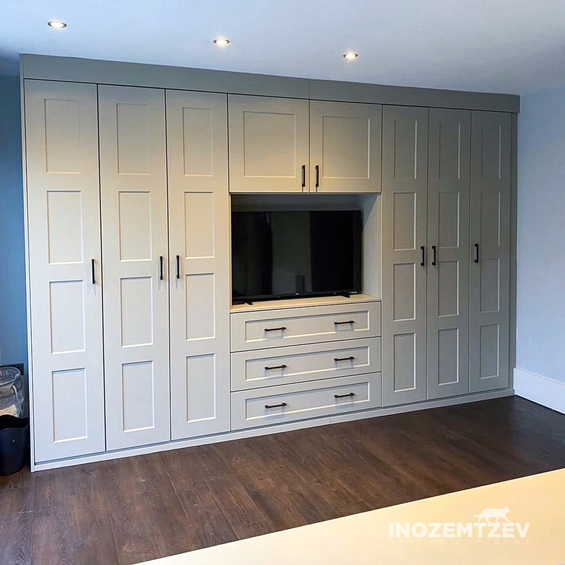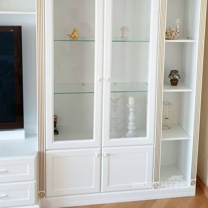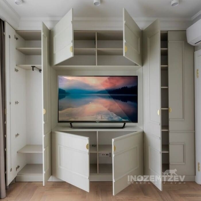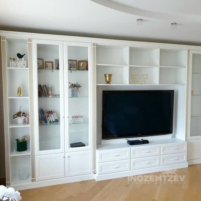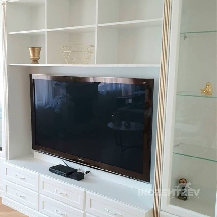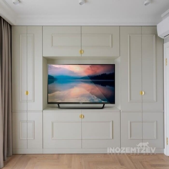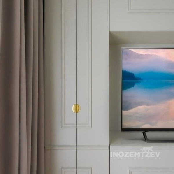 Стенка для телевизора в гостиную с декоративными молдингами и золотыми ручками, на дверях использована система выпрямления