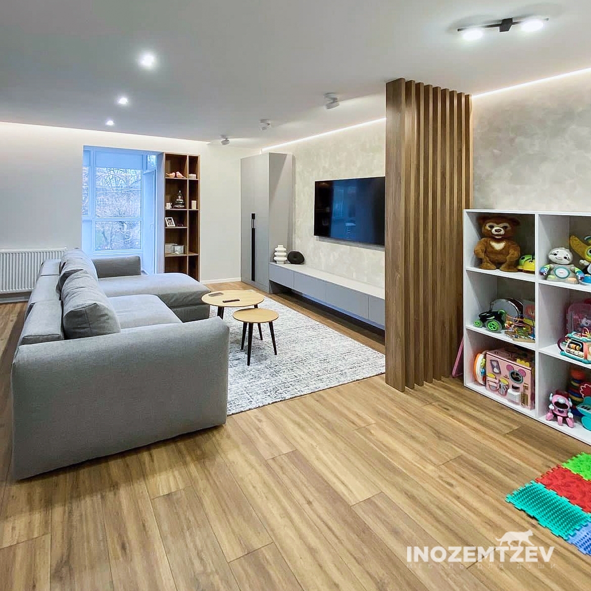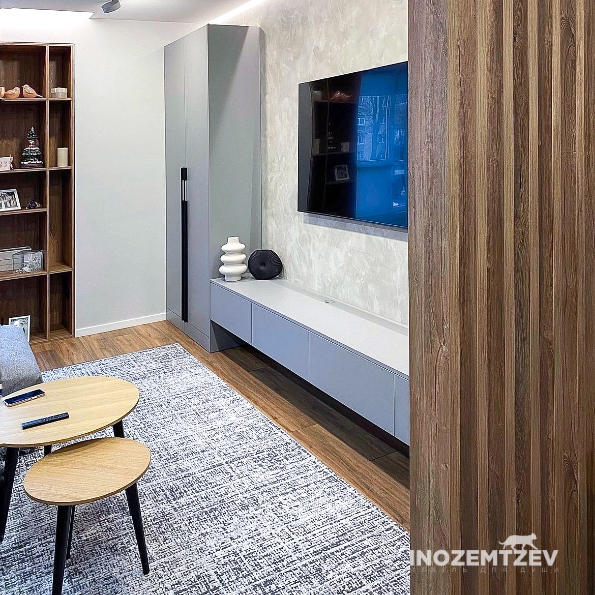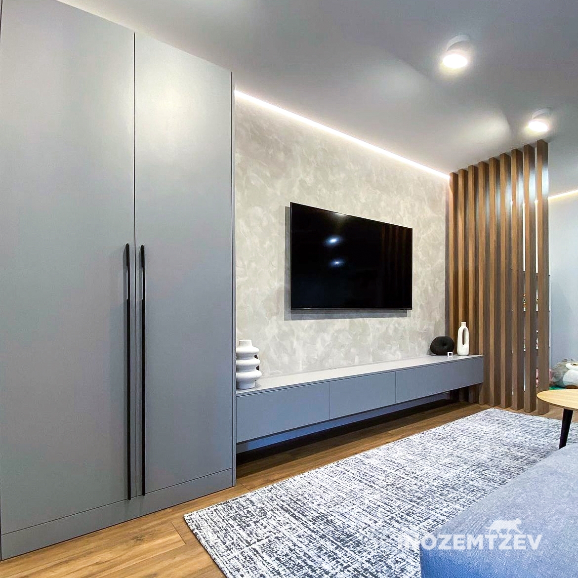 Стенка в гостиную, включающая в себя: длинная тумба под телевизор с ящиками с системой открывания push-to-open, двухстворчатый распашной шкаф и реечная перегородка для зонирования пространства