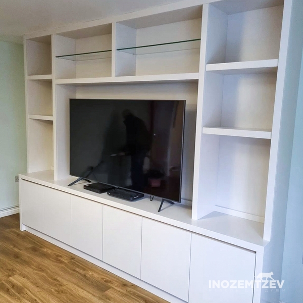 Стенка под телевизор с открытыми и закрытыми полками в белом цвете